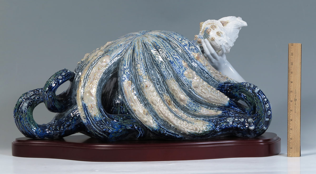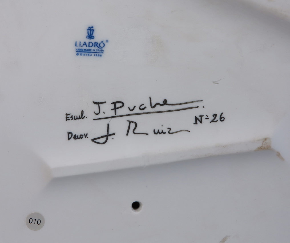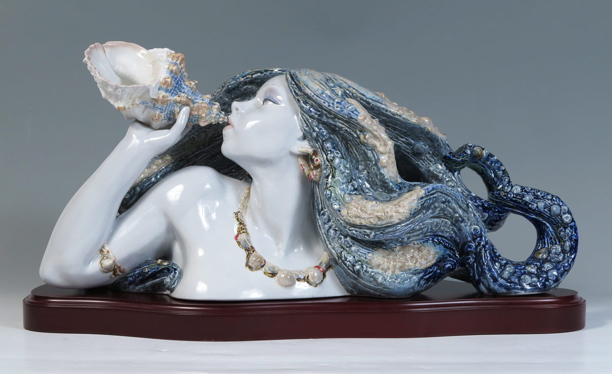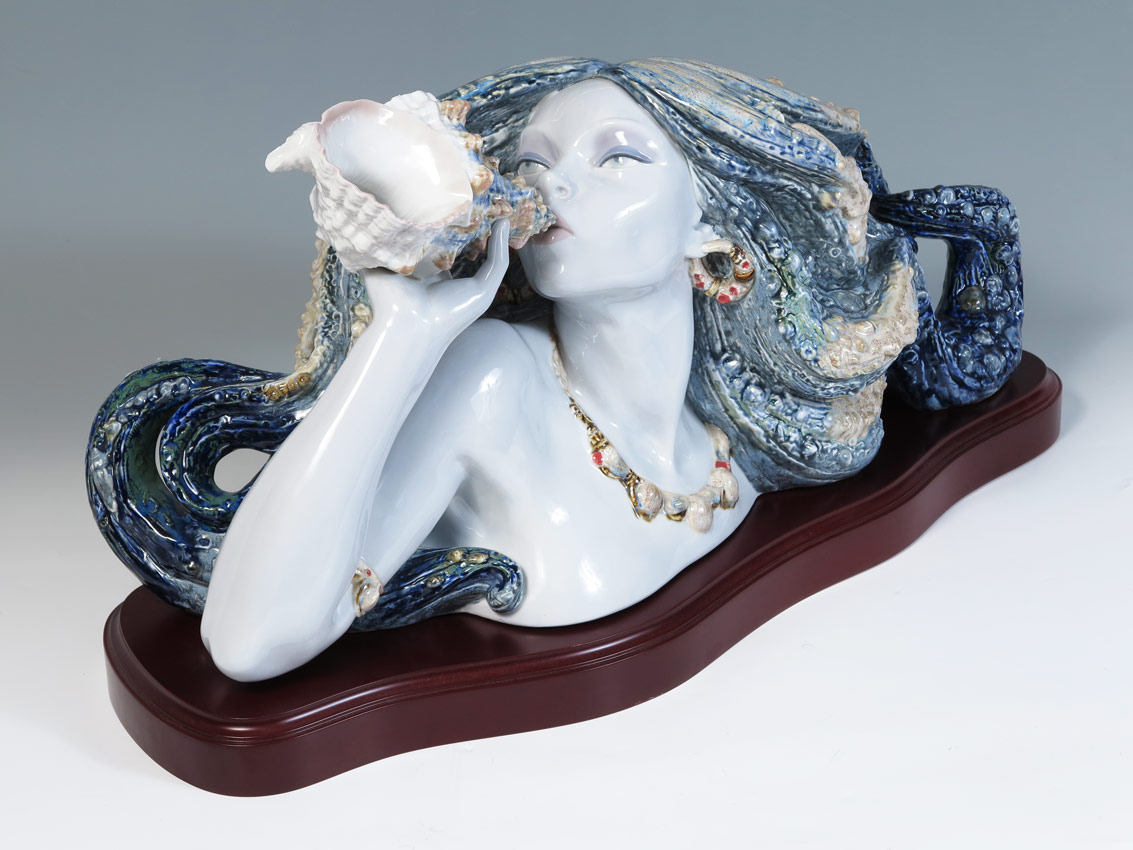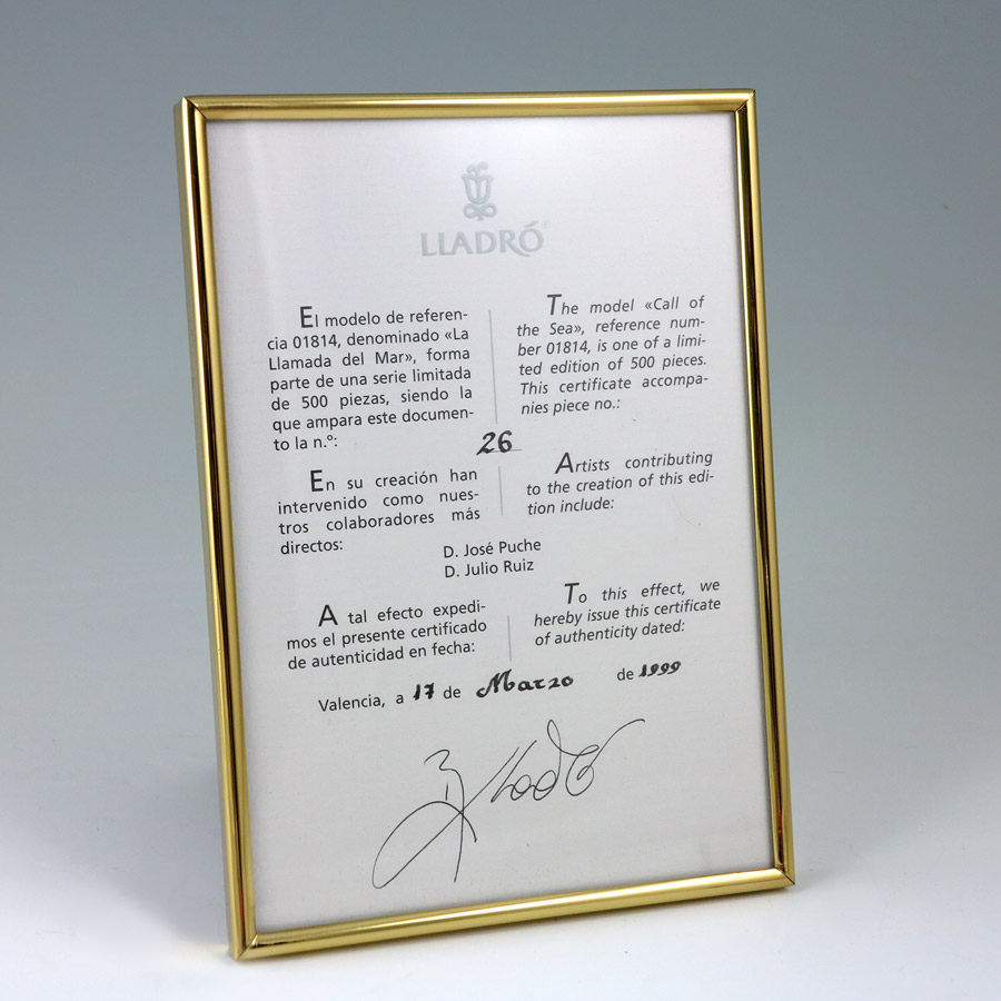 LLADRO PORCELAIN FIGURINE ''CALL OF THE SEA'': #1814, Jose Puche sculptor, issued 1997 retired 2006, Limited Edition 26/500, approx. 12''h. x 29'' x 13'', sold with base 1 7/8'' x 29 7/8'' x 11 7/8'' and framed certificate.