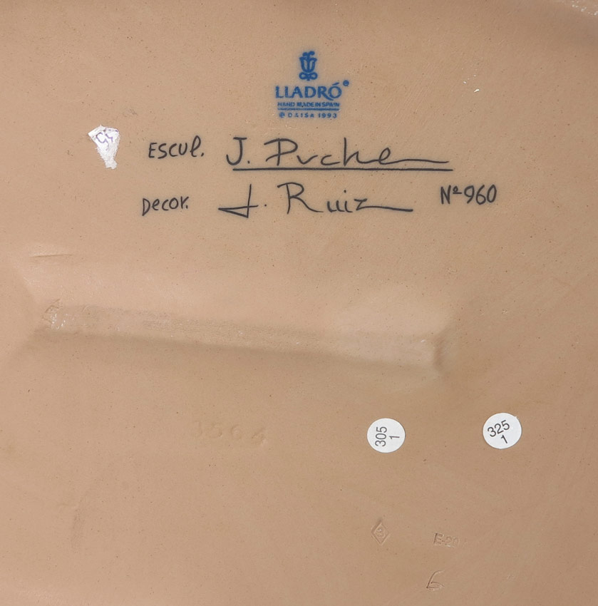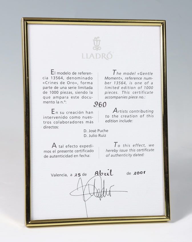 LLADRO PORCELAIN FIGURINE ''GENTLE MOMENT'': #3564, Jose Puche sculptor, issued 1994 retired 2002, Limited Edition #960/1000, approx. 17 3/4'' x 19 3/4'', sold with base 1 3/4'' x 15'' x 11 5/8'' and framed certificate.