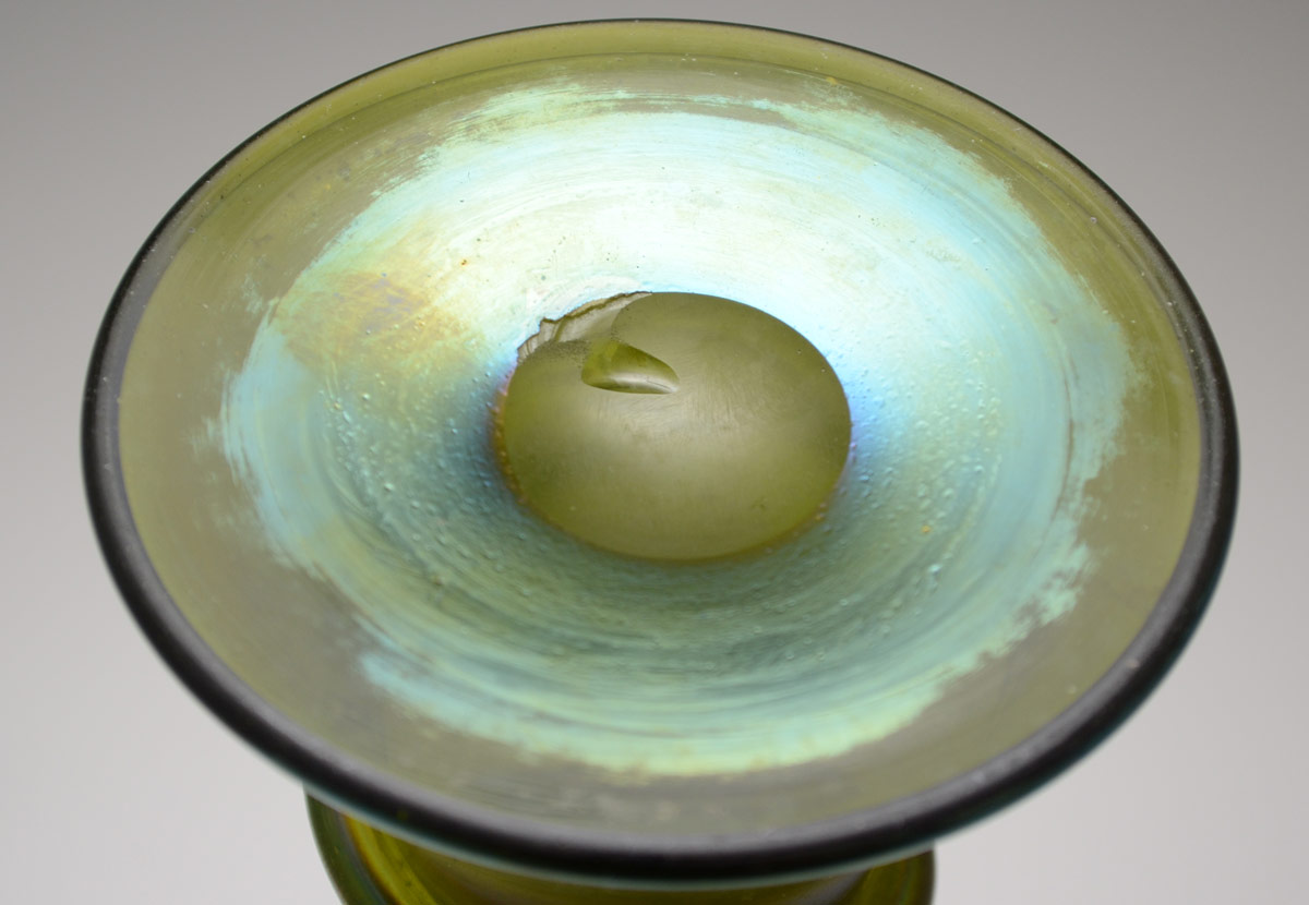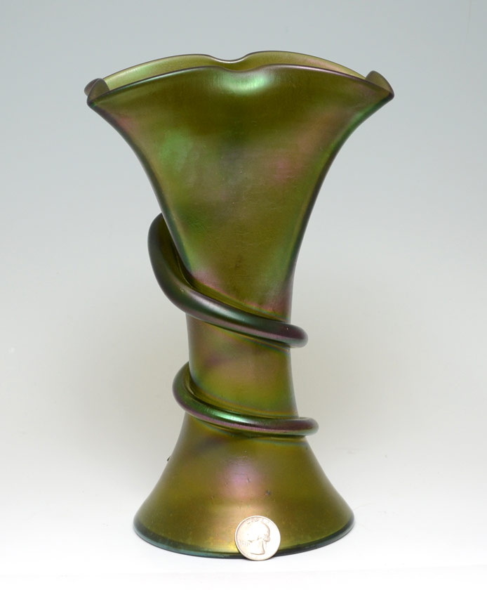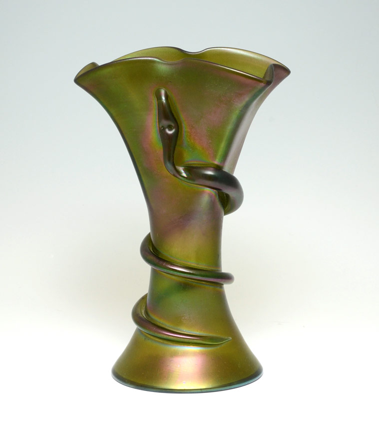 LOETZ IRIDESCENT GLASS VASE WITH SNAKE: Green iridescent vase with applied snake encircling vase. Measures 10'' h. x 6 1/4'' x 4 3/4''.
