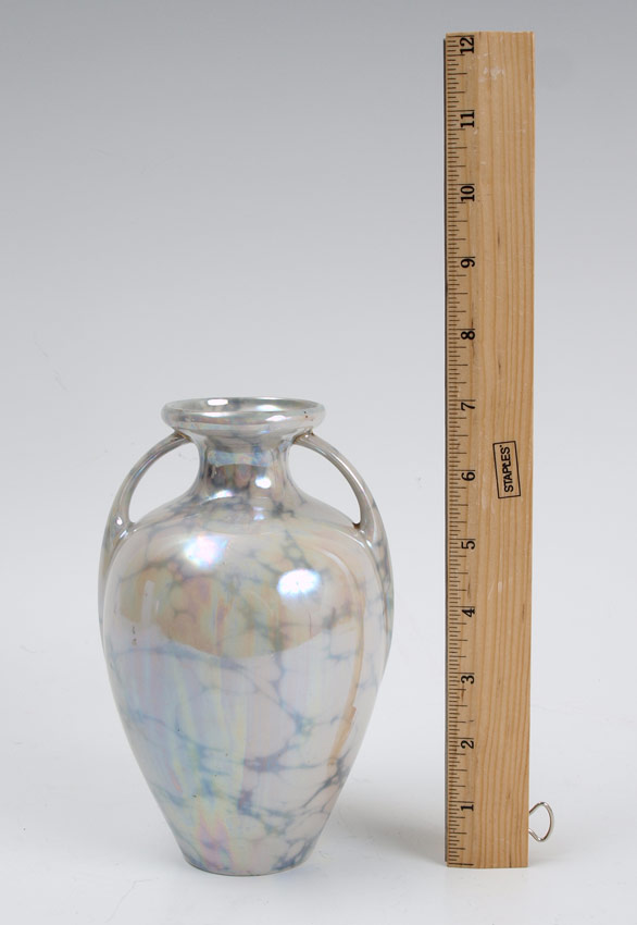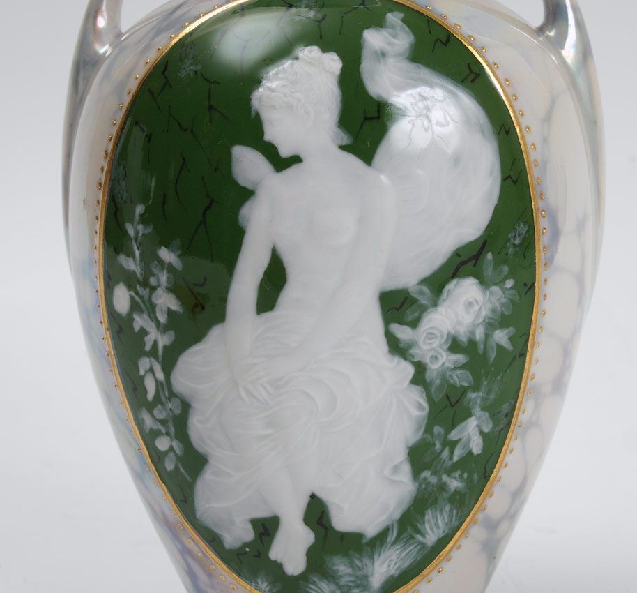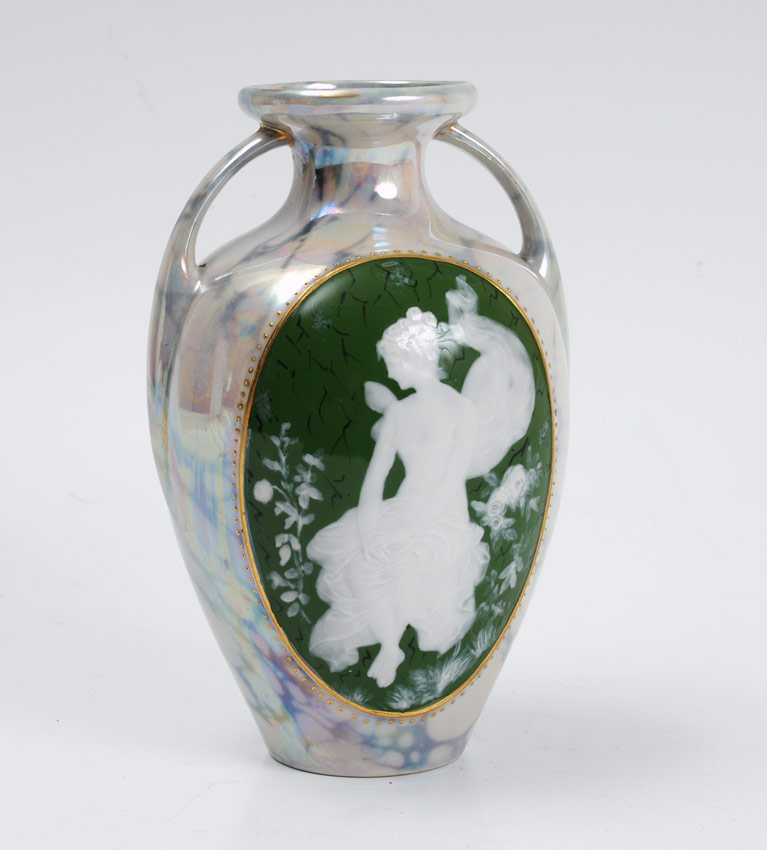 GERMAN PATE SUR PATE DOUBLE HANDLED VASE: Woman with flowing dress and flowers over green background motif with gilt border, iridescent marbleized glaze over balance of body. Unknown mark ''Marmora''? on base. Measures 7'' h. x 4 1/2''.