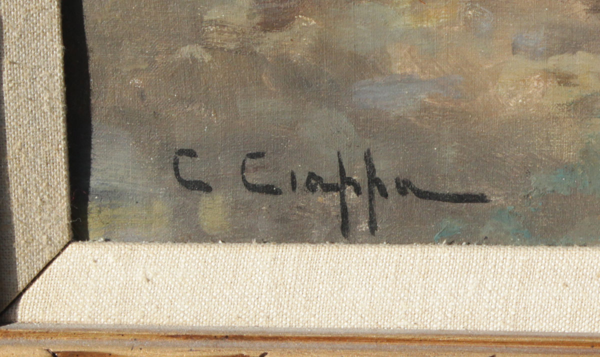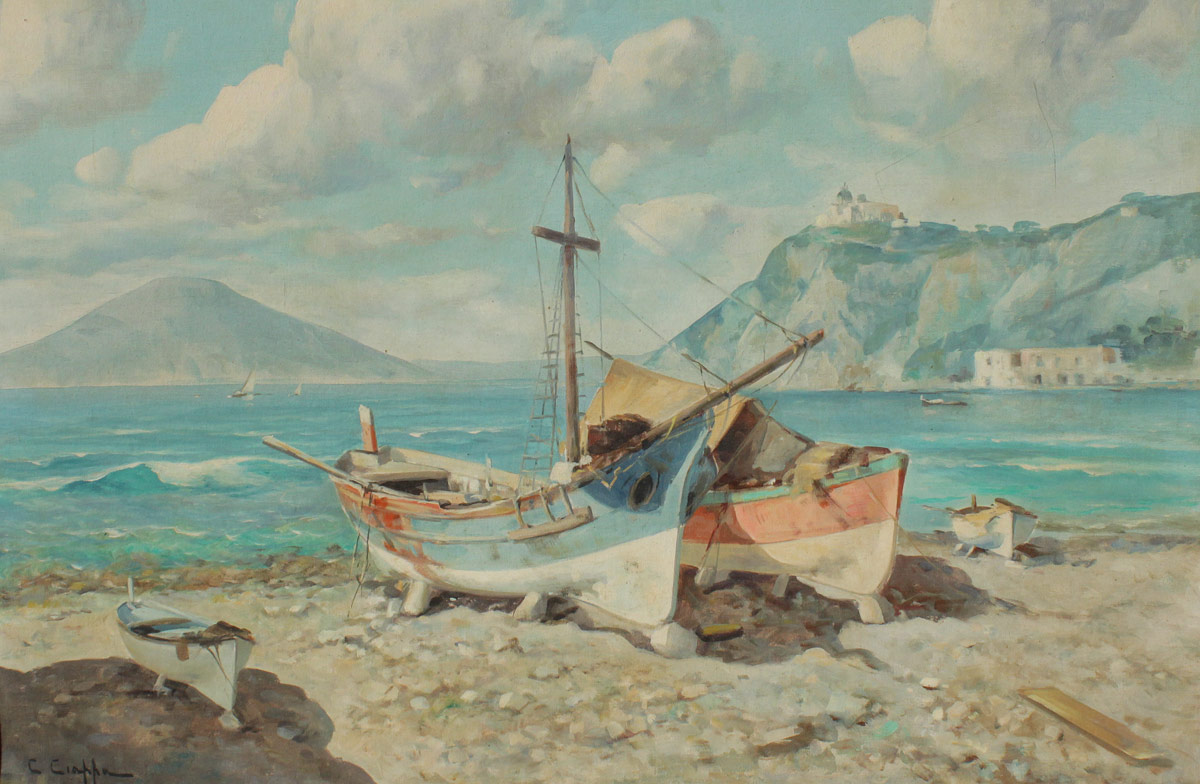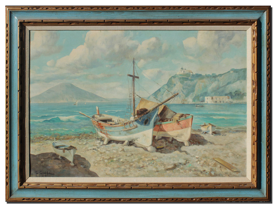 CIAPPA, Carlo, (Italian, 19th/20th Century): Mediterranean Harbor Scene with Boats on Shore, Oil/Canvas, 24'' x 36'', signed lower left, encased in Tuscan period carved and painted frame 31 1/2'' x 43''.