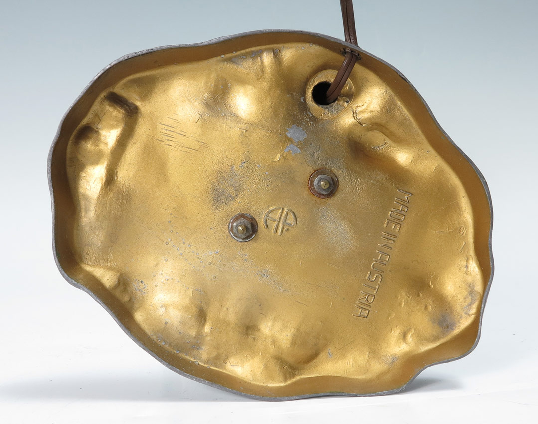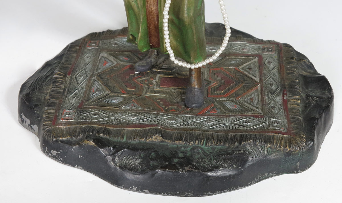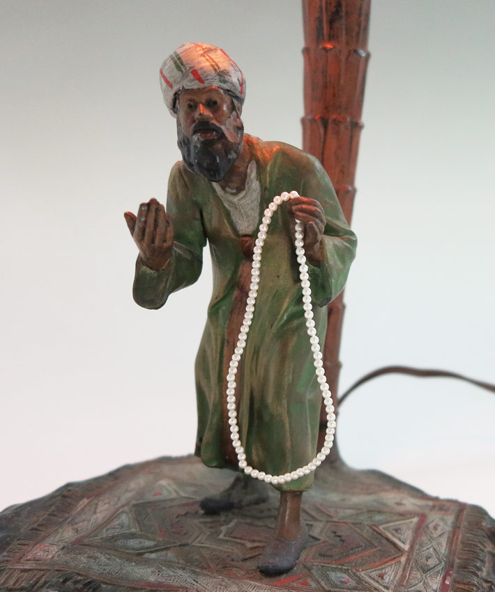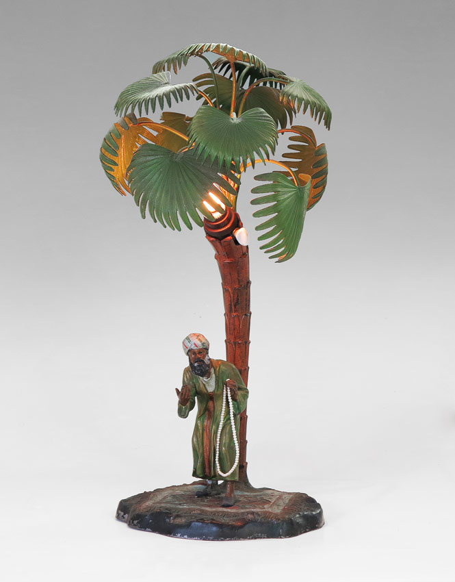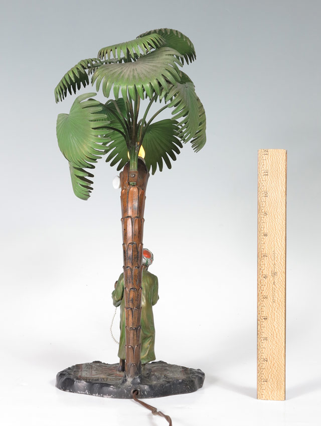 BERGMAN STYLE AUSTRIAN COLD PAINTED ORIENTALIST FIGURAL LAMP: Signed ''Made in Austria AP.'' Vendor standing on a rug, under a palm tree. Measures 17'' tall x 10'' x 7'' overall.