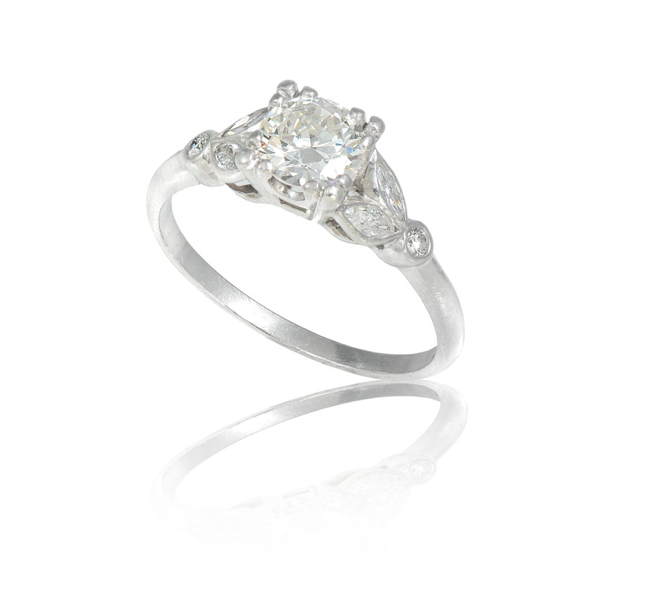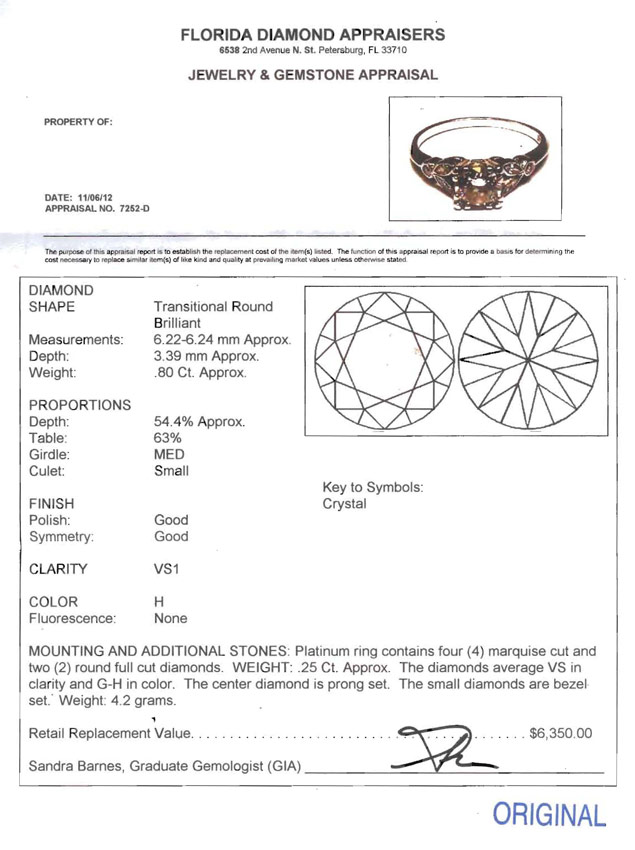 UNUSUAL PLATINUM DIAMOND RING: Platinum ring centers an approx. .80 Ct period transitional cut diamond of VS1 clarity and H color. The ''leaf'' design in the mounting contains 4 marquise and 2 round full cut diamonds totaling approx. .25 Ct., averaging VS in clarity and G-H in color. Size 6.5. Weight 4.2 grams. Sold with current Florida Diamond Appraisers GIA graduates appraisal for $6,350.