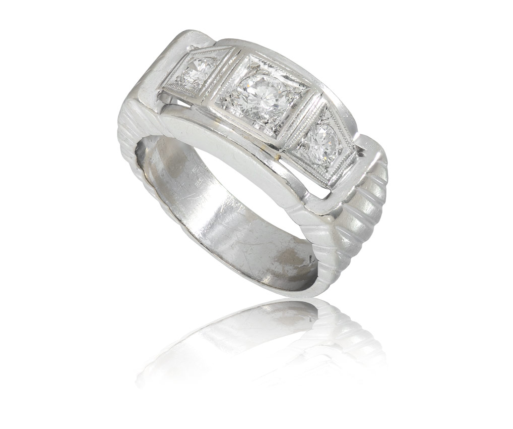 GENTS 3 STONE DIAMOND RING: 14K white gold ring contains 3 round brilliant cut diamonds. Weight: .75 Ct. Approx. The diamonds average VS in clarity and G-H in color. The diamonds are prong set. Size 9. Weight: 11.1 grams