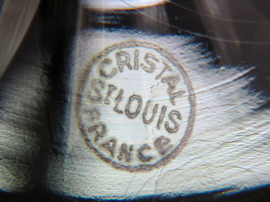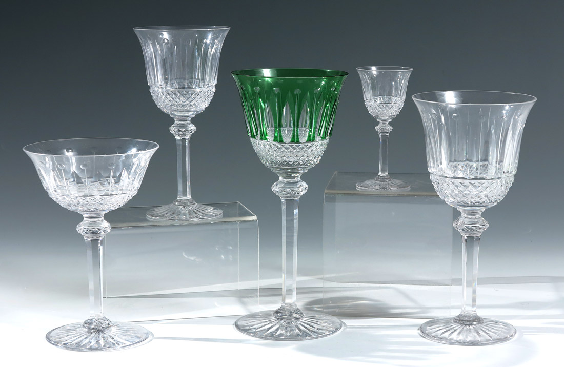 ST LOUIS FINE FRENCH CRYSTAL IN THE TOMMY PATTERN: 33 pieces to include 8 green wine hocks (7 3/4''), 7 goblets ( 7 1/4''), 8 sherbert champagnes (5 3/4''), 4 wine (6''0), and 6 cordial (3 3/4'').