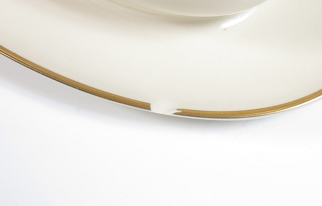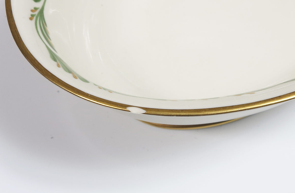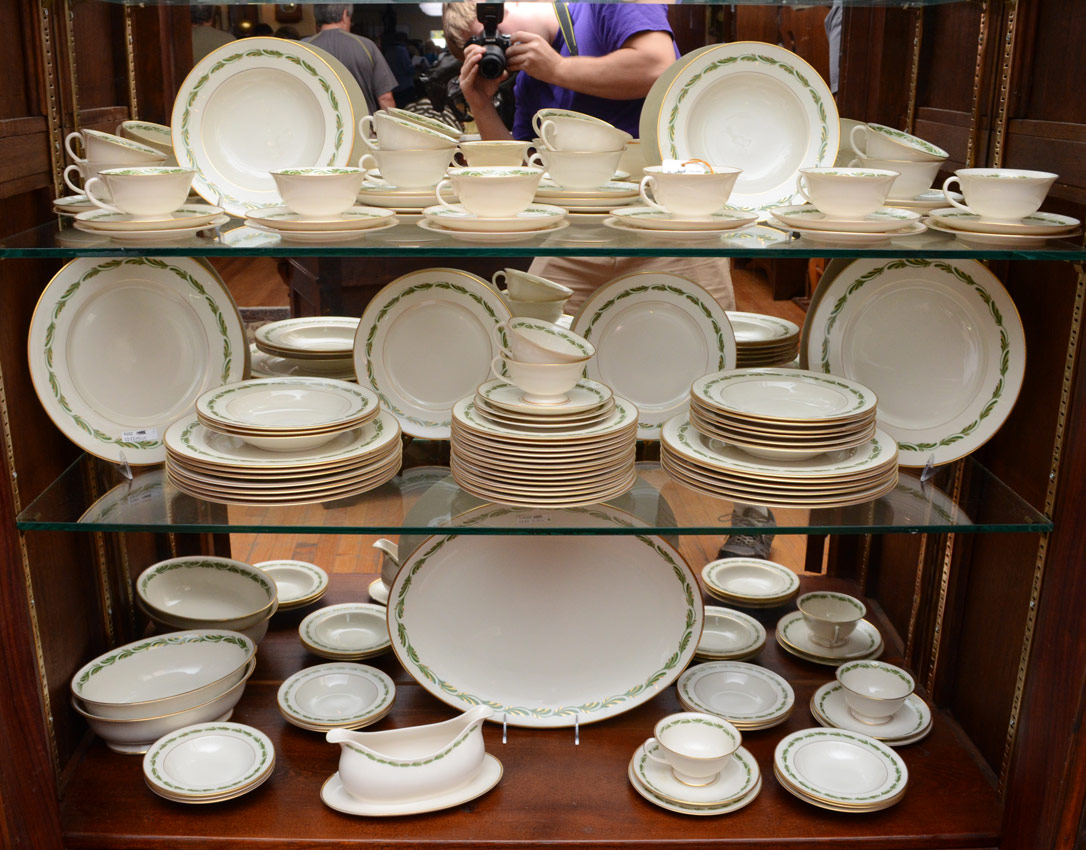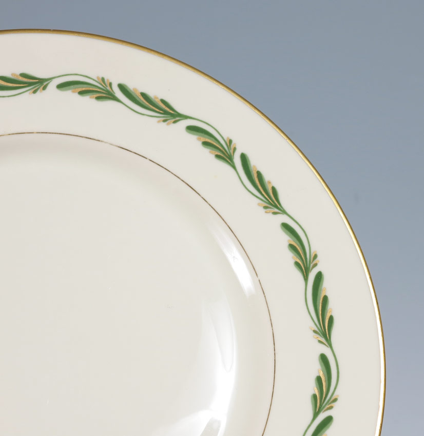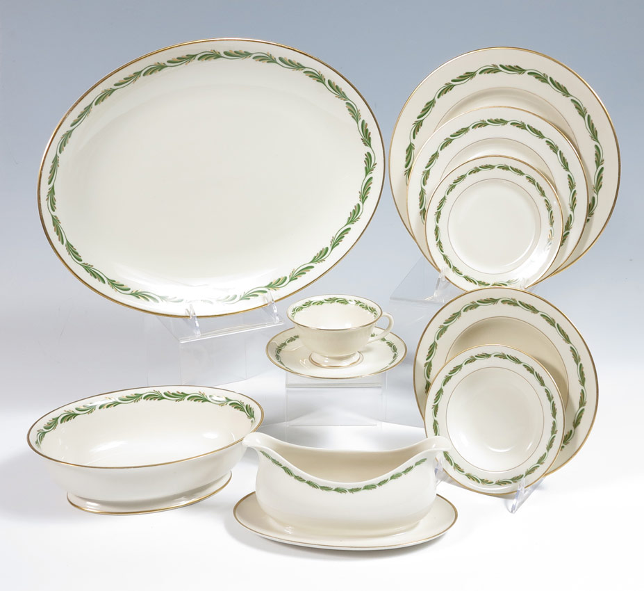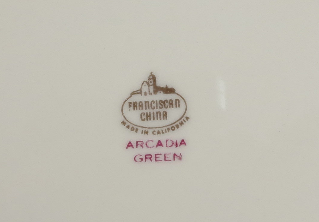 FRANCISCAN GREEN ''ARCADIA'' FINE CHINA: Approx. 105 pieces to include 15 dinner plates (10 1/2''), 15 salad, 16 bread, 11 soup bowls, 12 dessert bowls, 16 cups, 16 saucers, gravy (chip), 2 open vegetable and a 16'' platter.