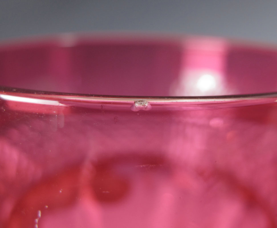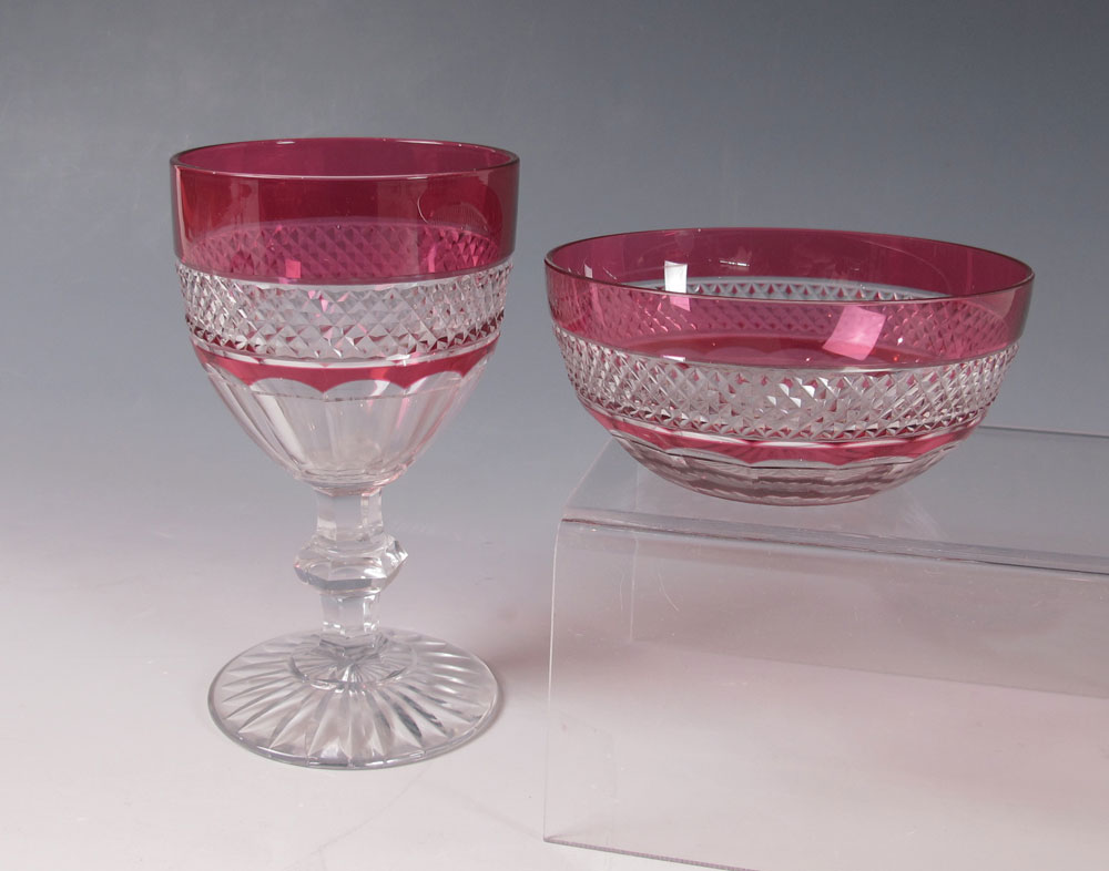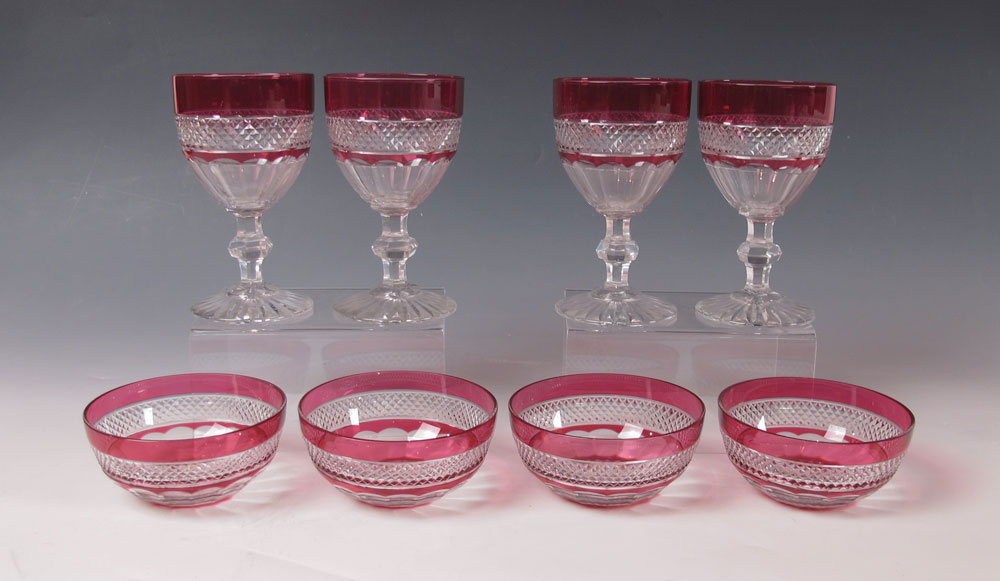 CRANBERRY OVERLAY CUT CRYSTAL STEMWARE AND BOWLS: Set of 4 stems, 5 3/4'', and 4 finger bowls, 4 1/4'' dia.