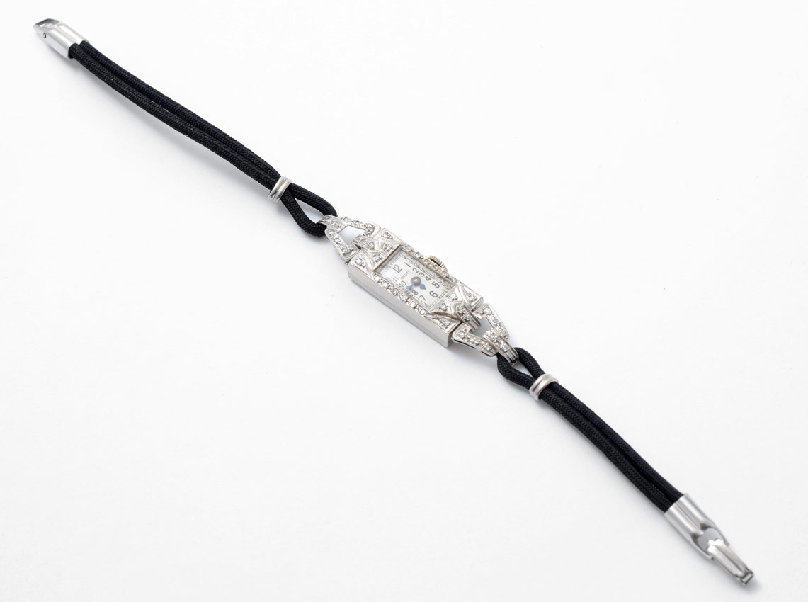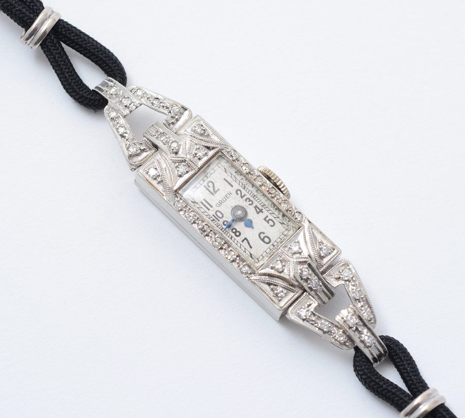 14K LADY'S DECO GRUEN WRISTWATCH: 14K white gold lady's Gruen wristwatch. 40 round single cut diamonds. Weight: .33 Ct. Approx. Rated VS in clarity and G-H in color. Mechanical jeweled movement. The watch is running. Replacement black cord bracelet. Length: 6.5'' Weight: 8.9 grams.