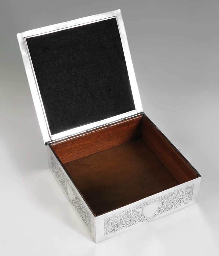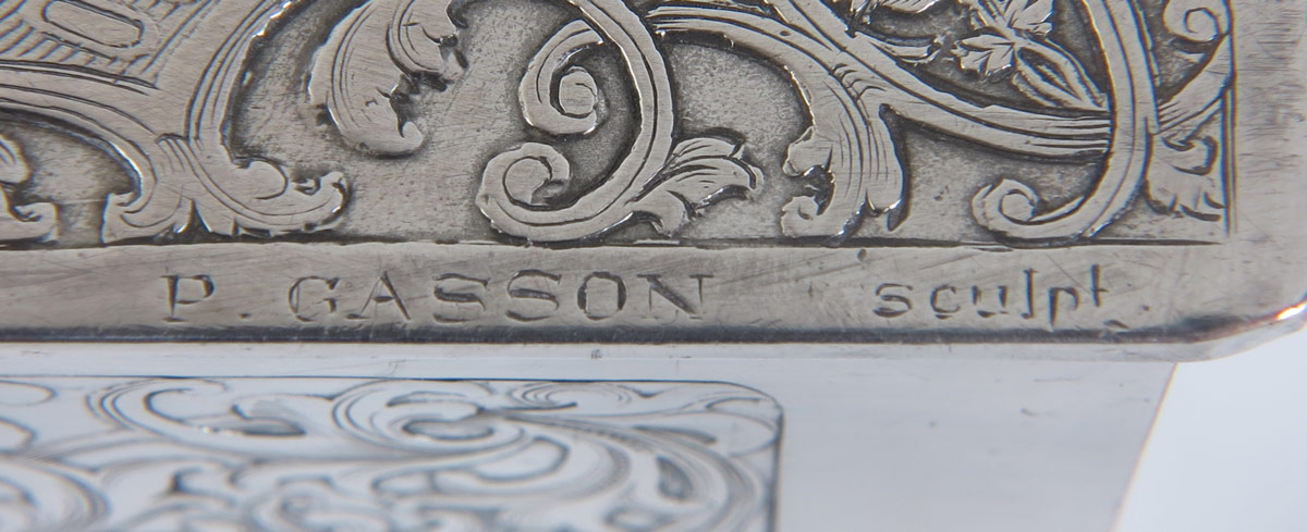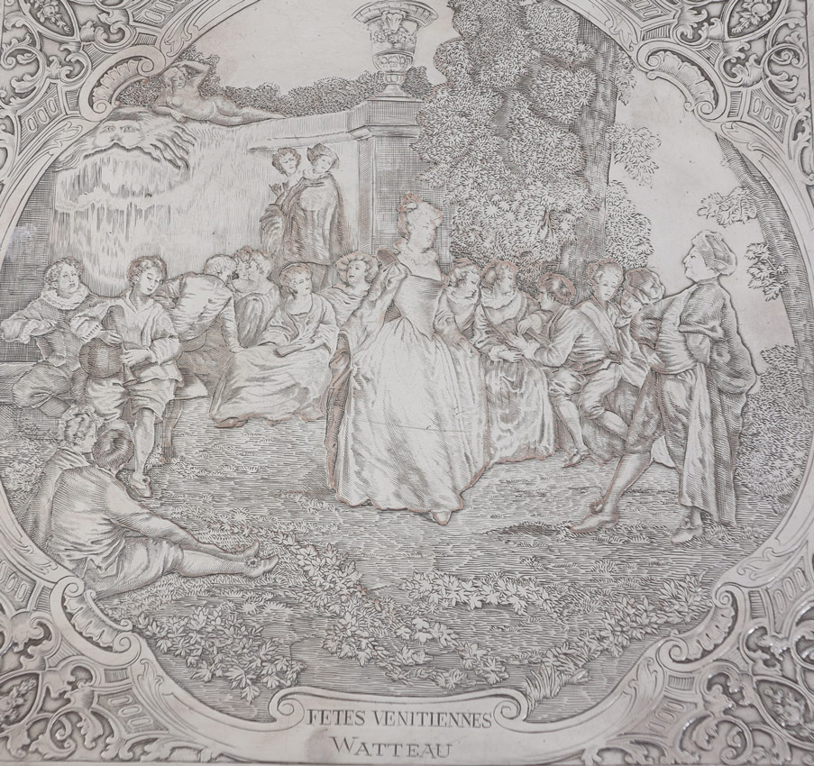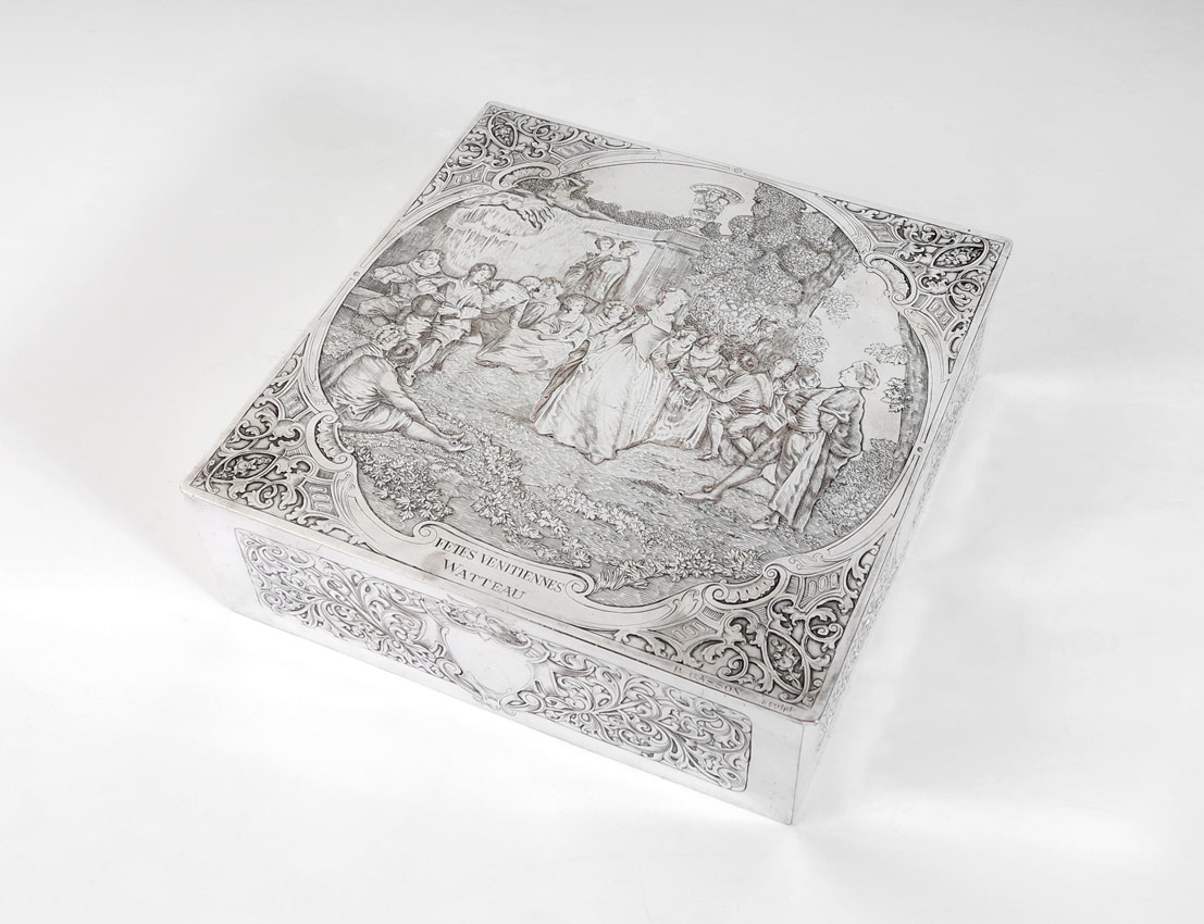WMF SILVERPLATE REPOUSSE BOX: Hinged engraved lid features featuring depiction of Jean-Antoine Watteau's ''Fetes Venietiennes'' painting, also marked P. Gasson Sculpt. Rococo engraved sides, marked on base with WMF and purity markings. Wood lined interior with felt top. Measures 2 1/4'' h. x 7'' x 7''.