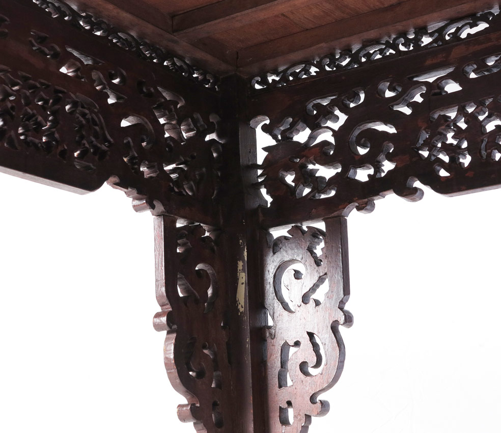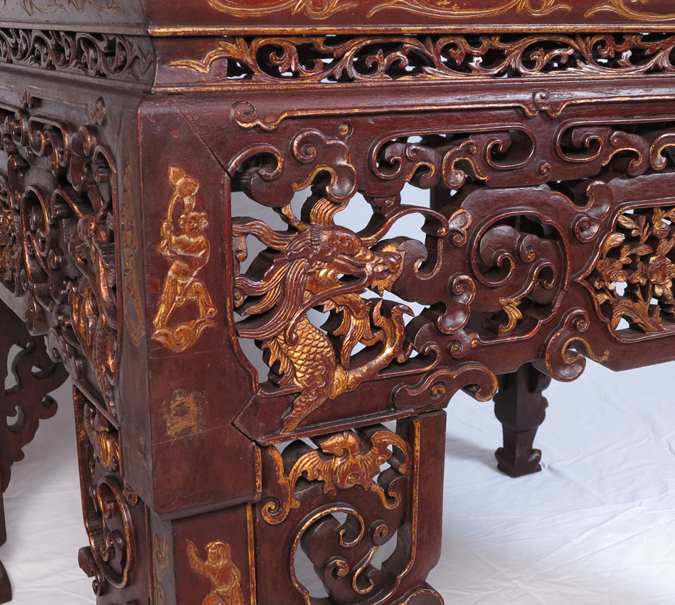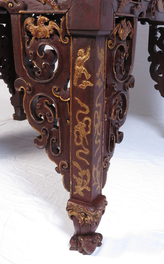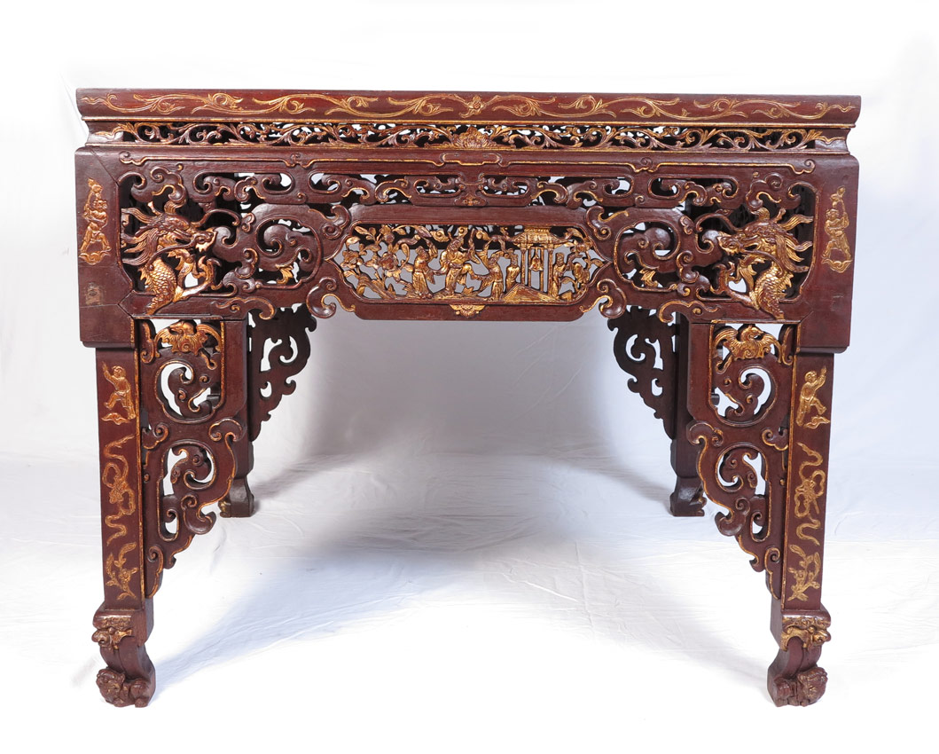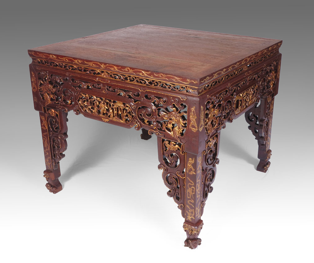 HEAVILY CARVED CHINESE CENTER TABLE: Parcel gilt center table with deep skirt, heavily pierced and carved in a dragon design, thru tenon construction. Measure approx. 34'' tall x 45 1/2'' square top.