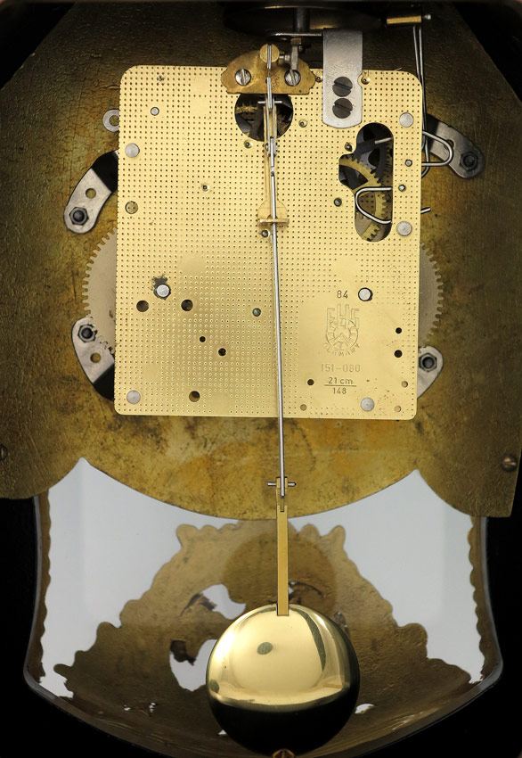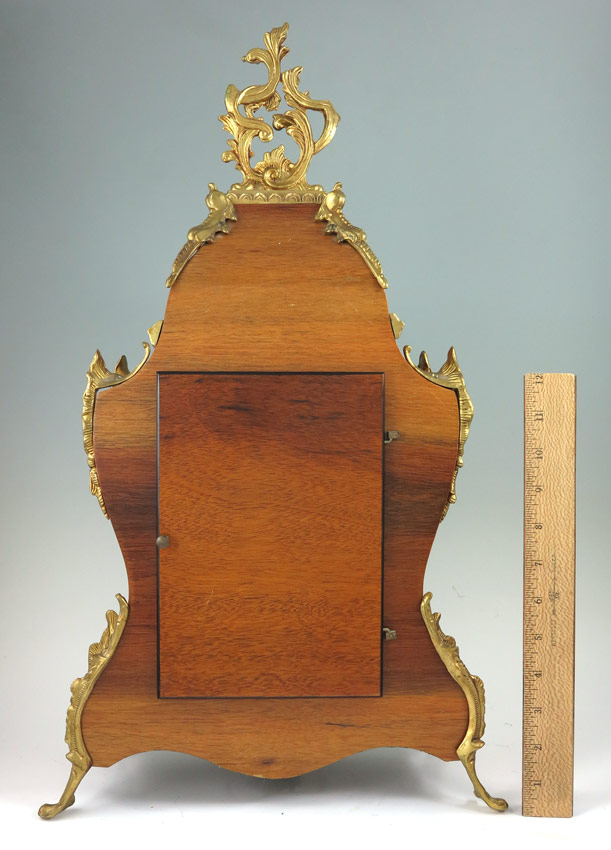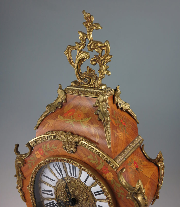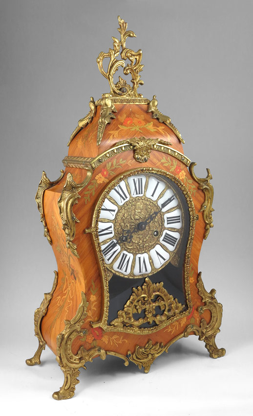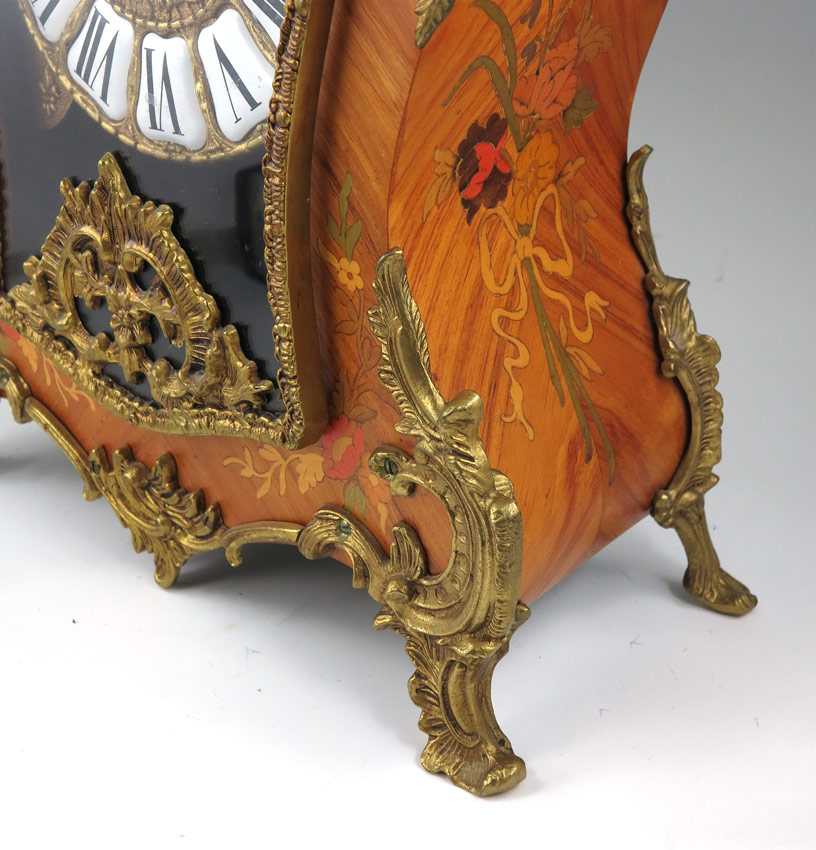 GERMAN INLAID ORMOLU MOUNTED MANTLE CLOCK: 20th century production, floral marquetry inlaid case with ormolu mounts. Cast metal dial with Roman numerals on porcelain inserts. German time and strike movement, key and pendulum in office. Measures 22 1/2'' h. x 13'' x 5 3/4''.