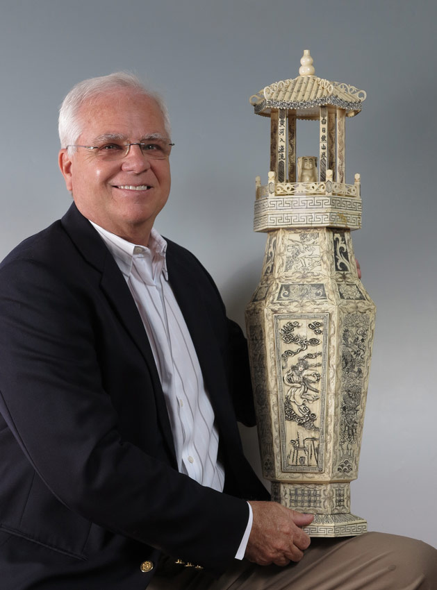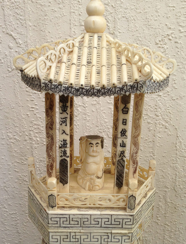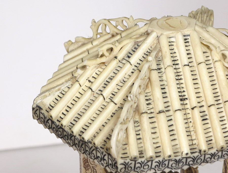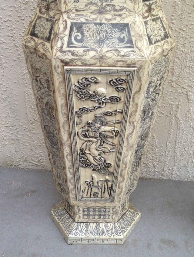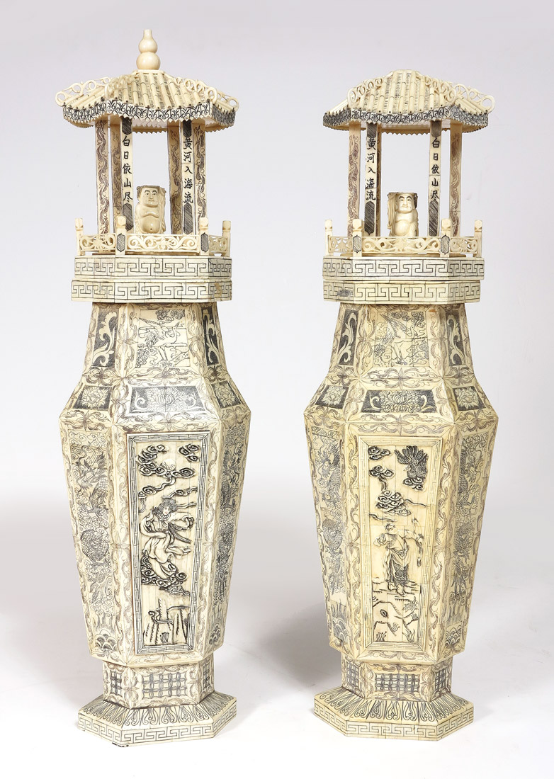 PR ASIAN CARVED AND SCRIMSHAW DECORATED BONE COVERED URNS: Impressive bone clad faux urns, 20 3/8'', with pagoda lids, 11''h with support plug, each centered with carved Buddha figures and overall scrimshaw decoration in reverse view. Overall approx. 31'' h. x 9'' x 5 1/2''