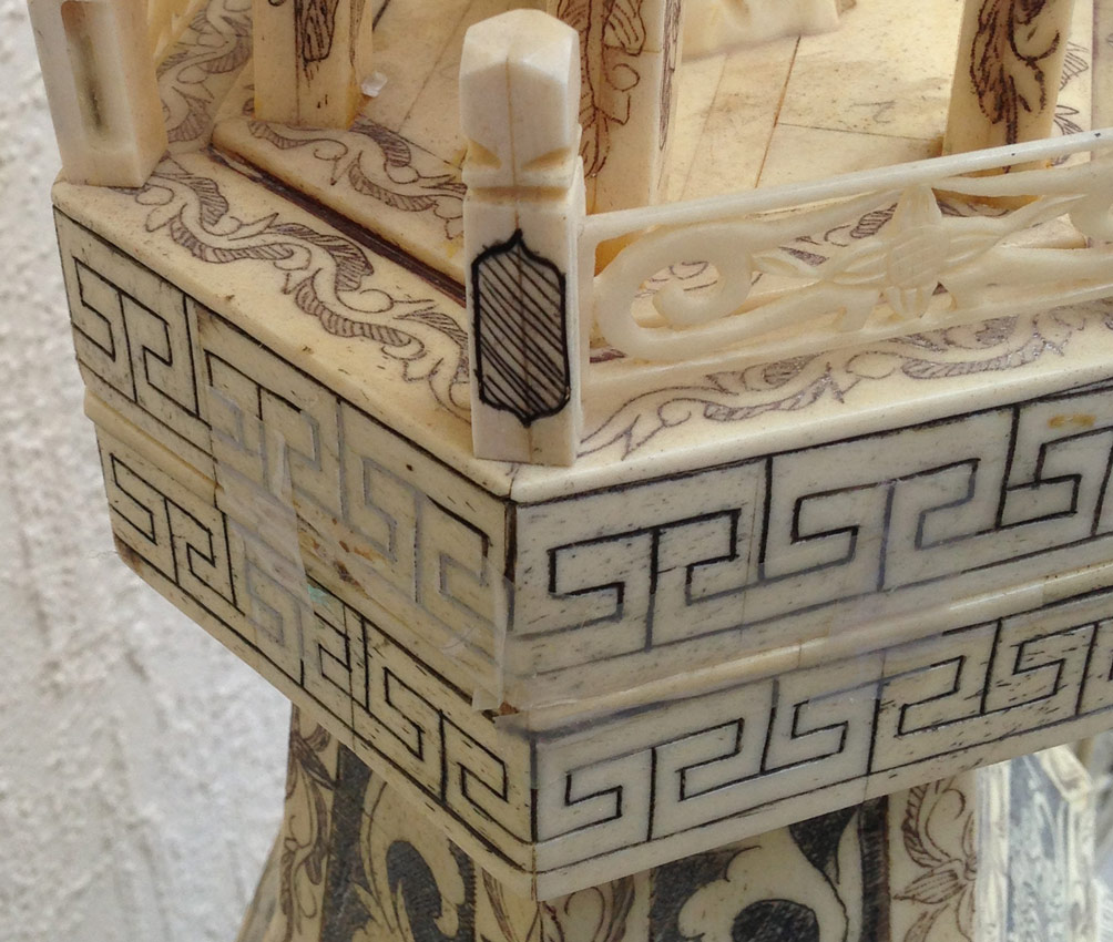 CONDITION: Missing one section of trim, finial, and top trim decoration section to one pagoda.