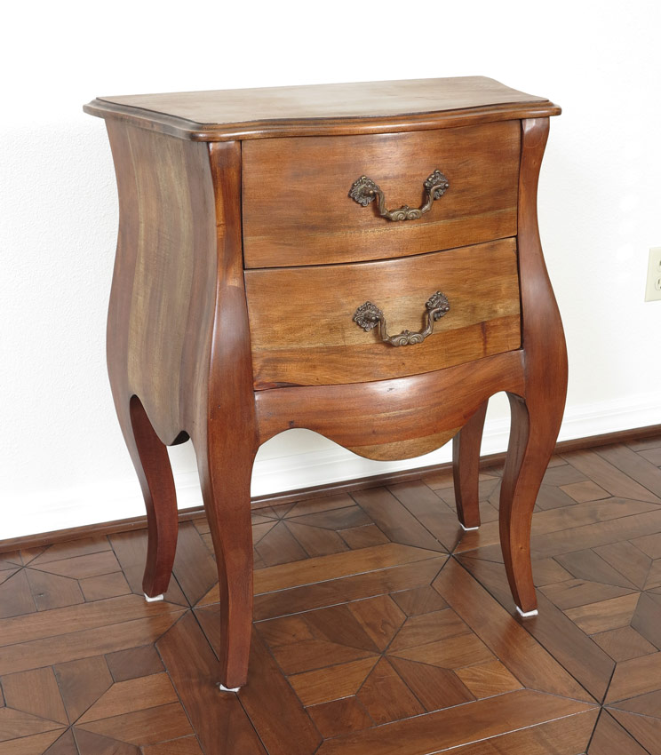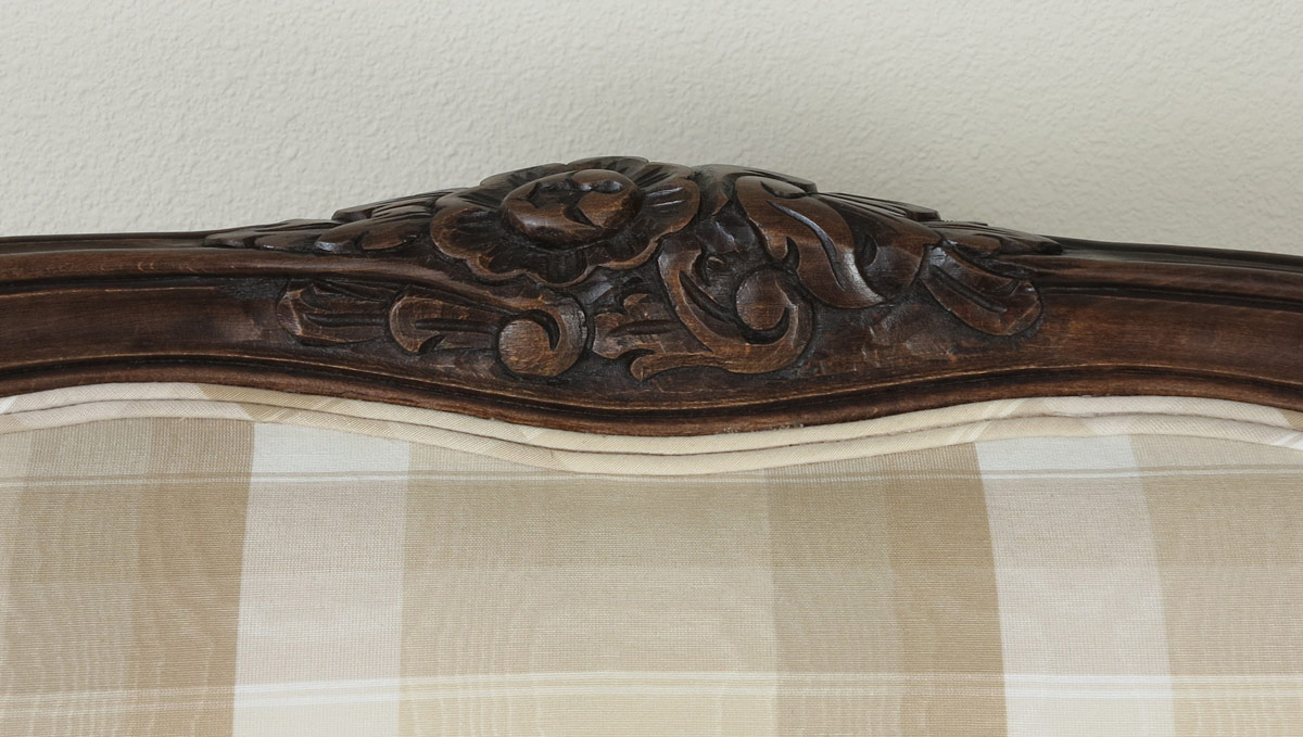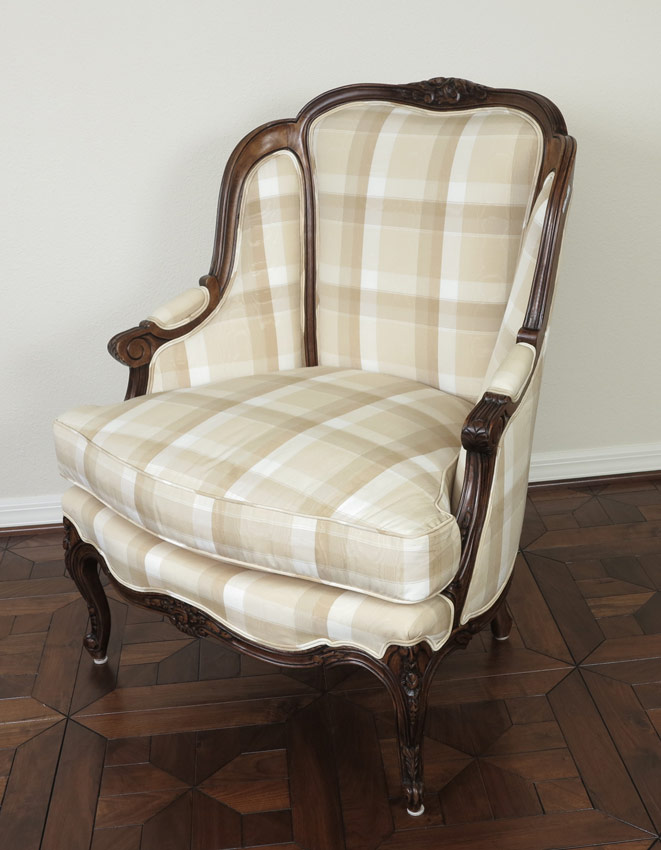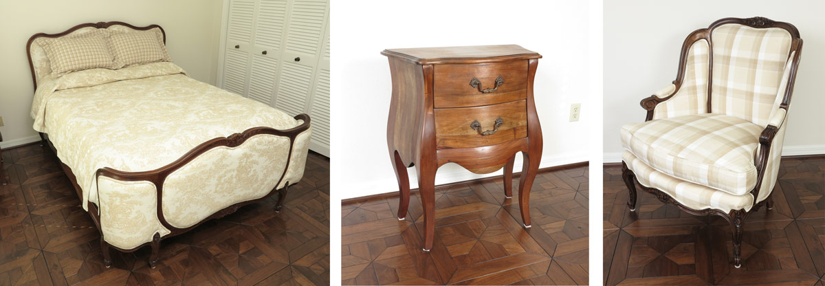 FRENCH CARVED WALNUT BED, CHAIR AND NIGHT STAND: Accumulated 3 piece bedroom to include Queen bed with Toile covered headboard and footboard (h 44'' tall x 63). Complete with original rails and later metal rails. Bergere chair covered in coordinating plaid, and a 2 drawer Bombay nightstand. 31'' tall x 25'' x 14''.