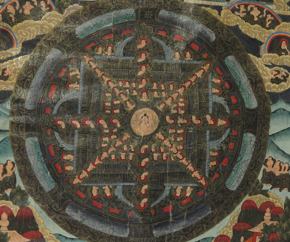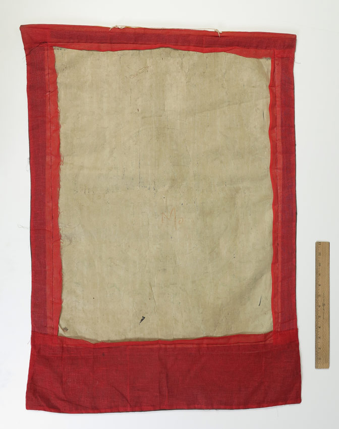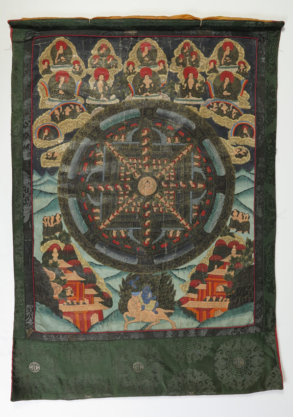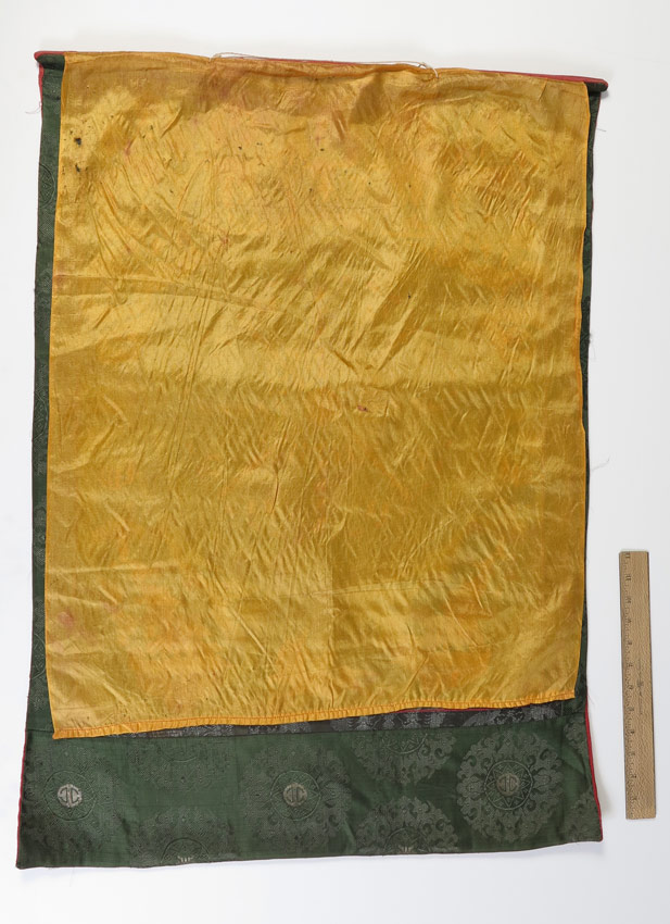 TIBETAN THANGKA: Repeated images of Buddha in various poses with buildings and another Buddhist deity below. Black and green border, retains yellow silk cover. Overall measures 35'' x 25 1/4''.