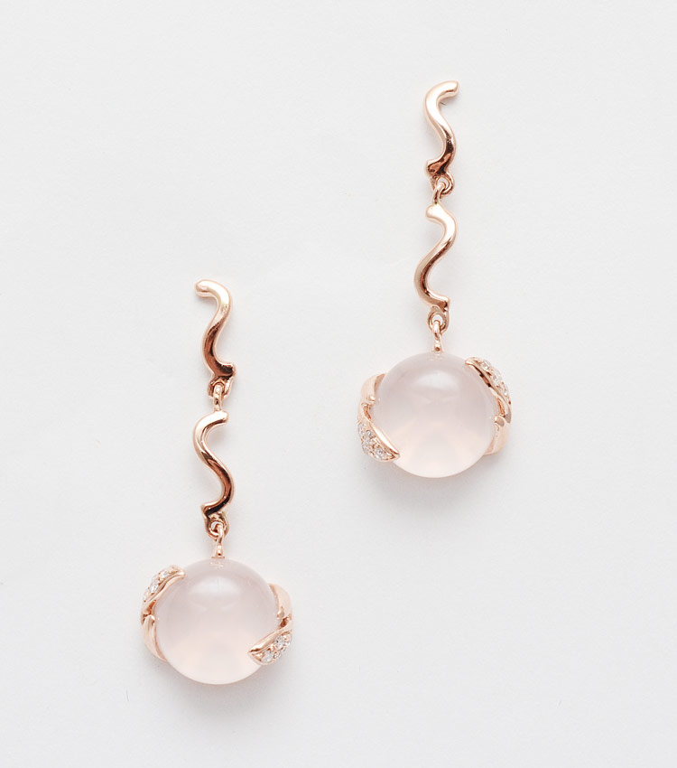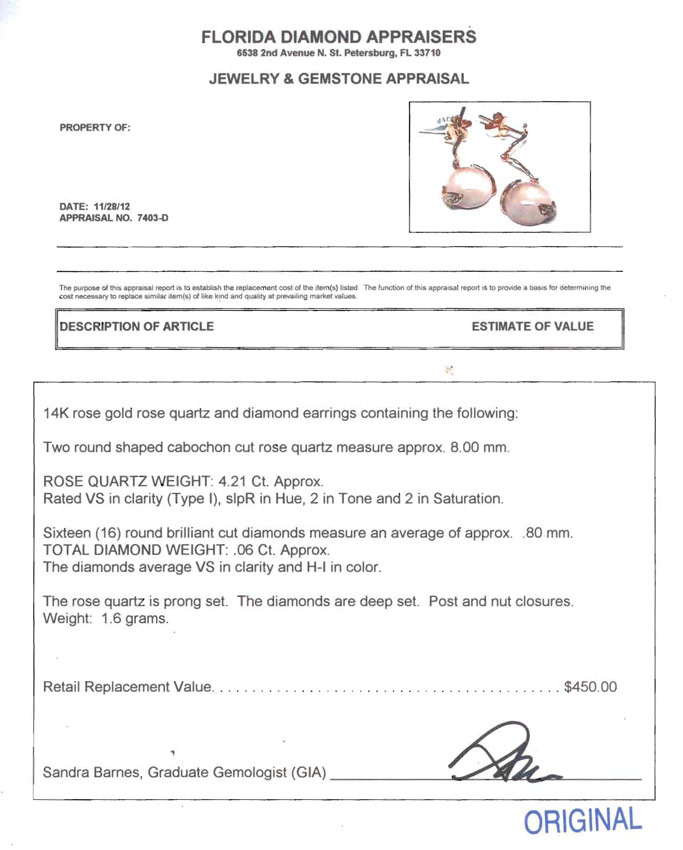 14K ROSE GOLD ROSE QUARTZ & DIAMOND EARRINGS: Two cabochon cut rose quartz total approx. 4.21 Ct, each 8 mm. The 16 round brilliant cut diamonds total .06 Ct., VS clarity. Deep set diamonds, prong set quartz. Post and nut closures. Length 1''. Weight 1.6 grams. Sold with current Florida Diamond Appraisers GIA graduates appraisal for $450.