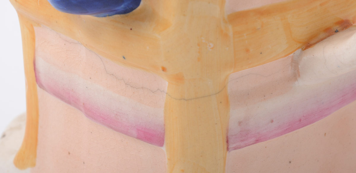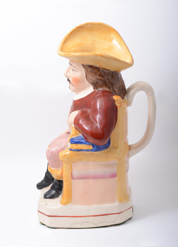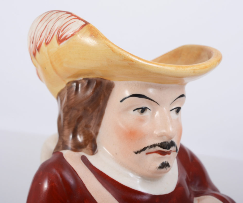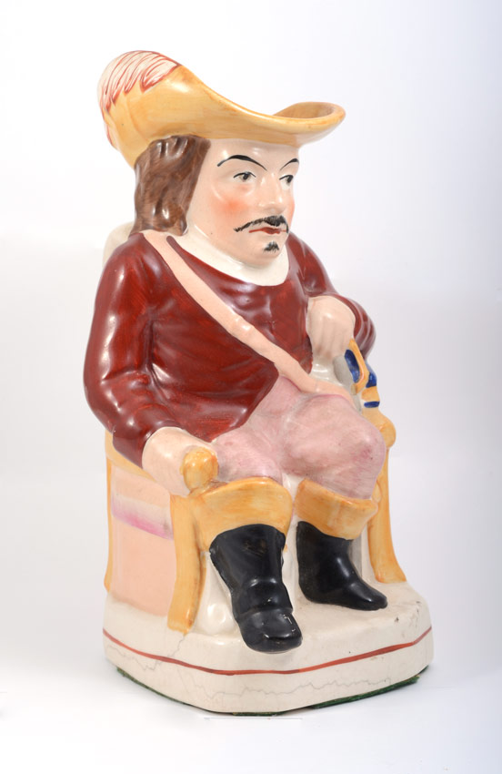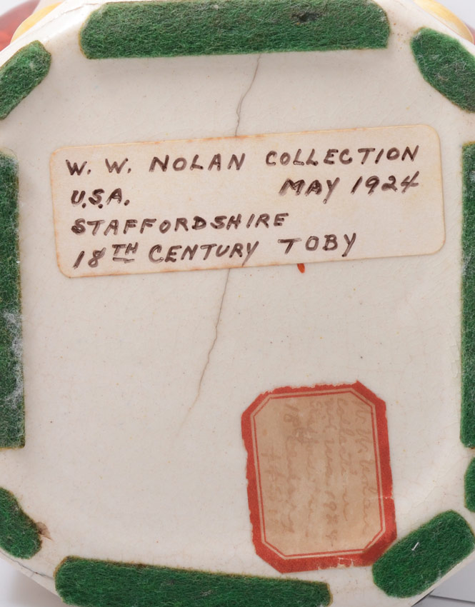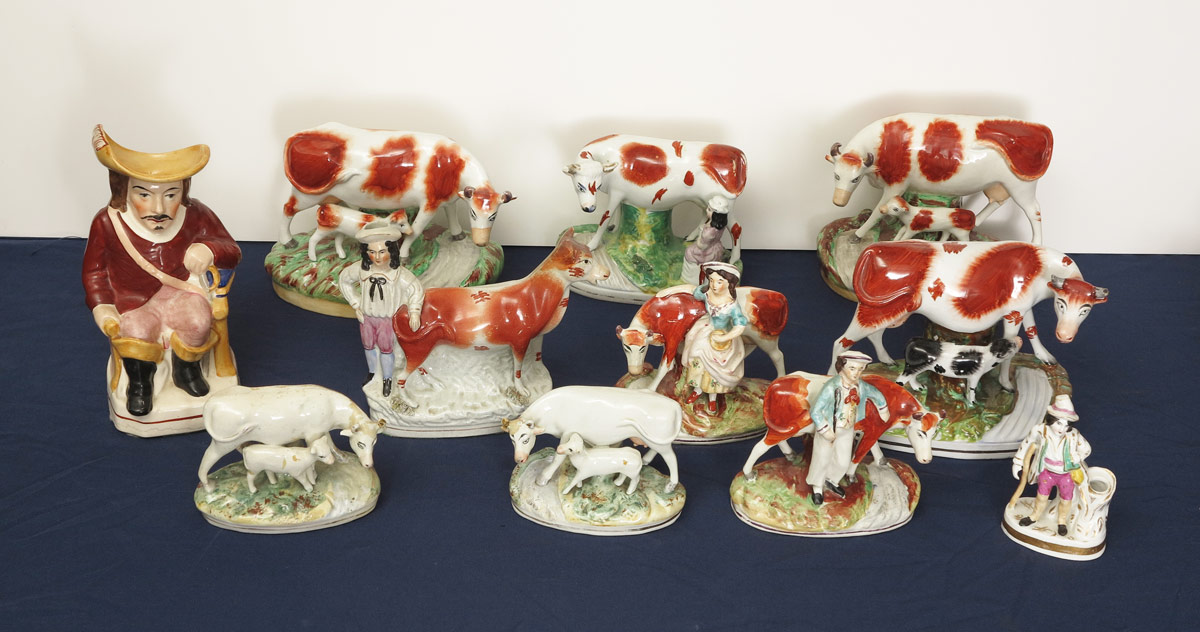 11 STAFFORDSHIRE FIGURES INCLUDES COWS: 9 featuring cows in some capacity, largest overall 7'' h. x 9'' x 4 1/2''. Sold with Toby jug of a seated man with his sword, with old label stating ''W. W.. Nolan Collection, 1924, USA, 18th Century Toby'', 10'' h. x 7''. Also sold with small toothpick holder or spill vase featuring boy with stick. No makers marks.
