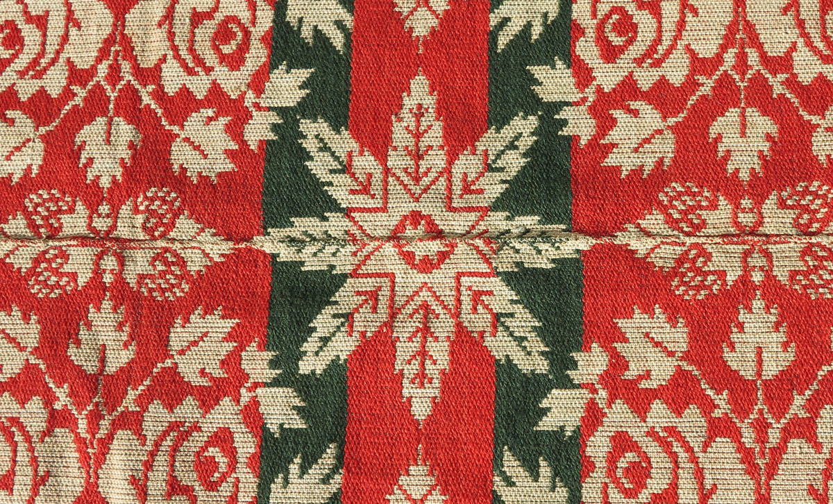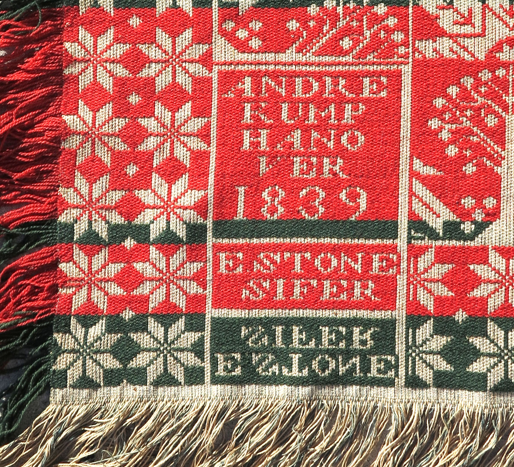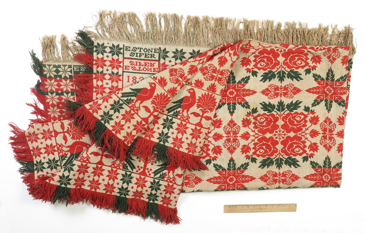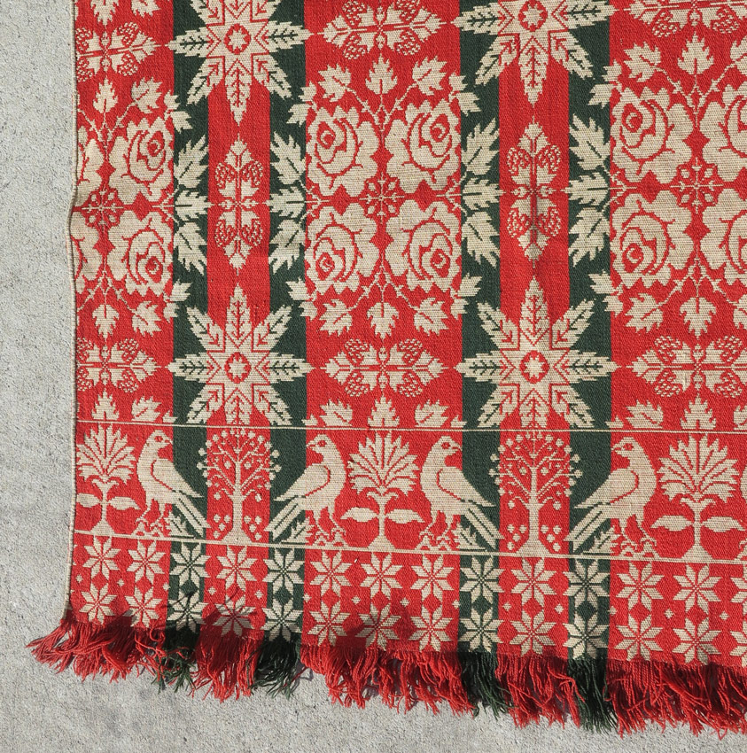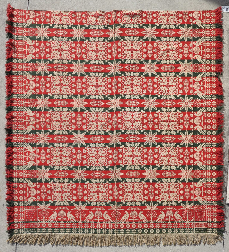 1839 HANOVER JACQUARD COVERLET: Red, green and white with doves, roses, snowflakes, and other decoration. Signed Andre Kump, Hanover, 1839, E. Stone Sifer. Measures 88'' x 87''.