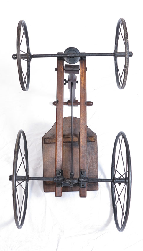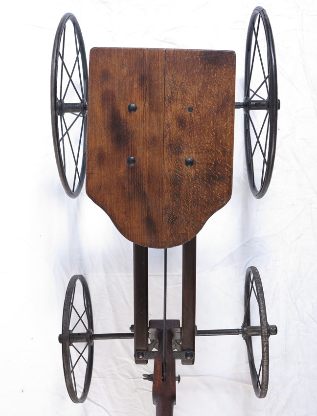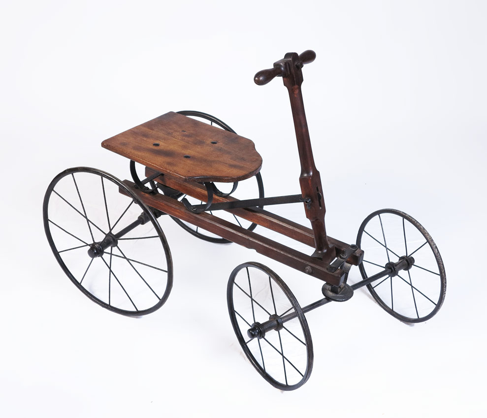 ANTIQUE CHILD'S PUMP CAR: Wood and iron construction, pump and push operation, steering with feet. No makers name or label. Measures 28 1/2'' h. x 34 1/4'' x 20 1/2''.