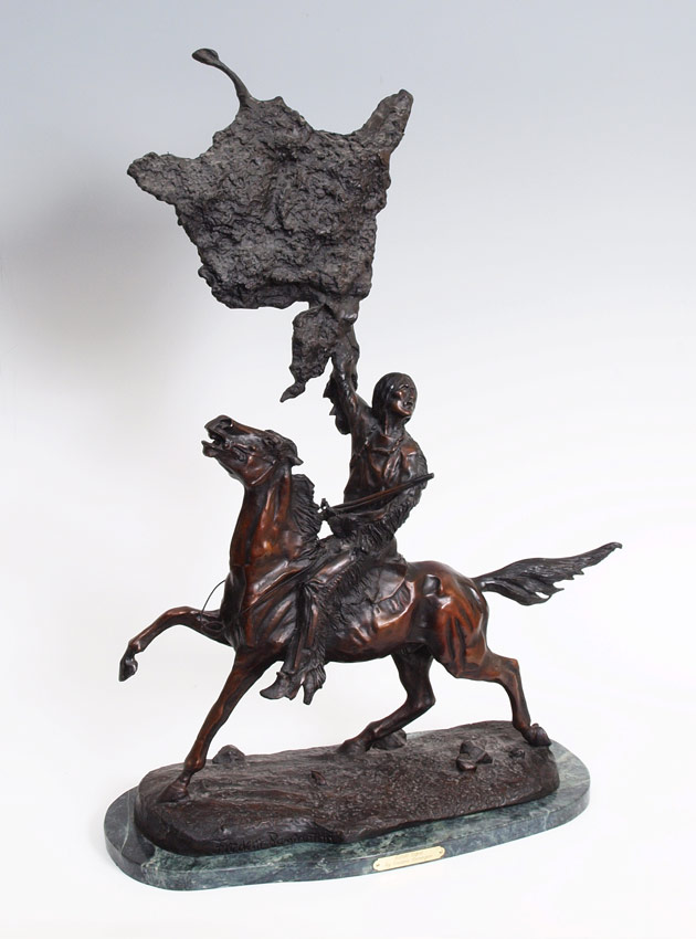 BUFFALO SIGNAL BRONZE AFTER REMINGTON: 29 1/2'' h., affixed to a polished marble green plinth, 30 1/4'' overall x 23'' w.