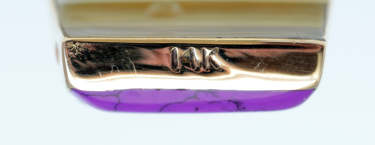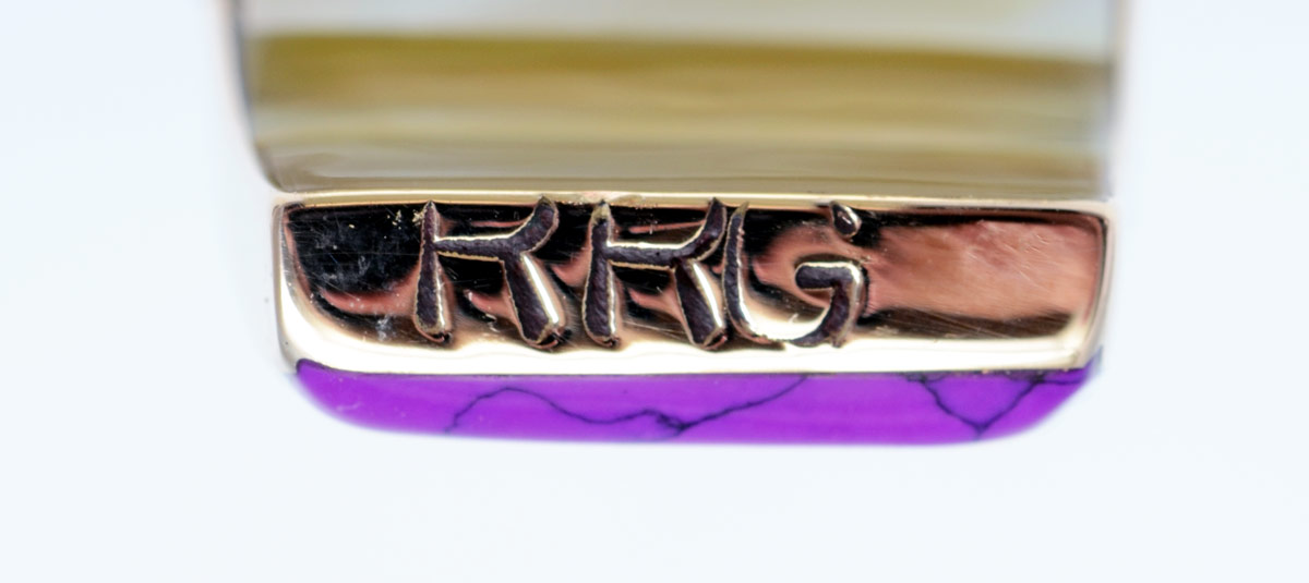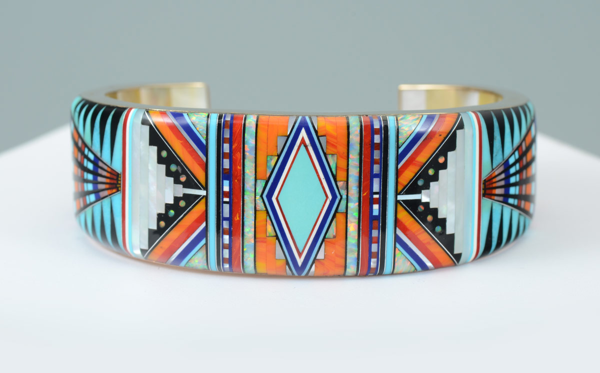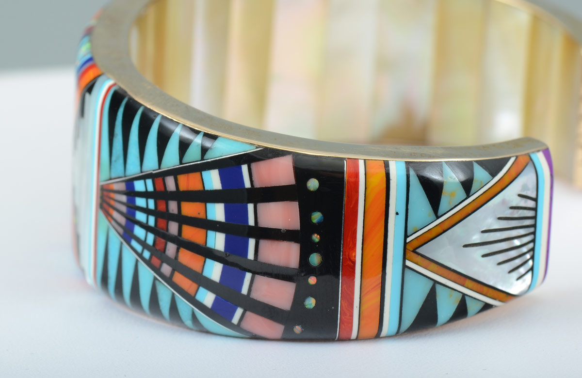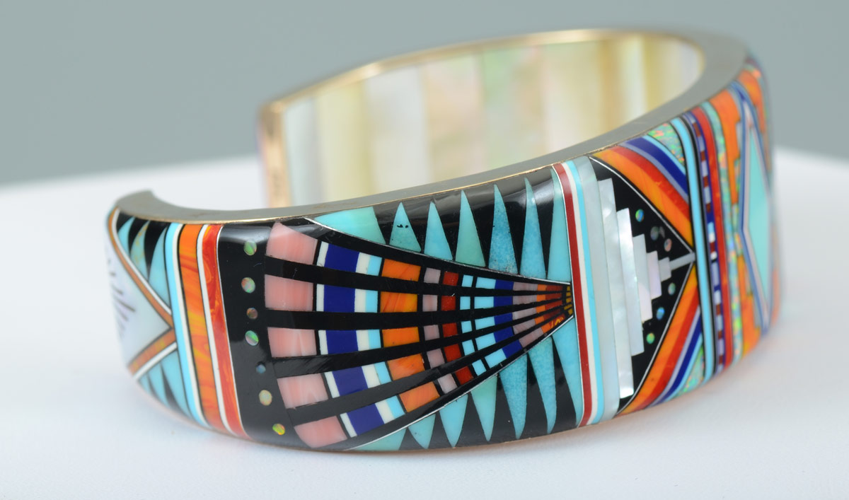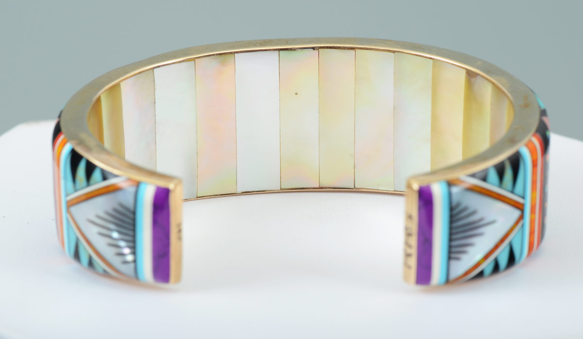 14K YELLOW GOLD NATIVE AMERICAN INLAY BRACELET: Amazing incredibly detailed inlay of stones to include Turquoise, Coral, Opal, Onyx, Mother of Pearl, Spiney Oyster and White Turquoise. Rare and hard to find work of art where even the inside has inlay. Signed RRG marked 14k, inside opening measures approx. 2'' x 2 5/8'', outside opening measures approx. 2 3/8'' x 3'', width tapers from 1'' to 5/8'', overall weight 67.1 grams.