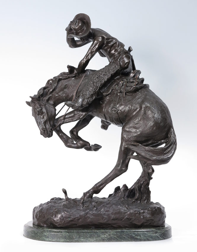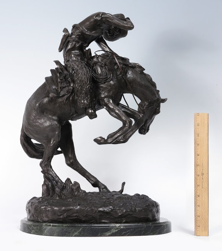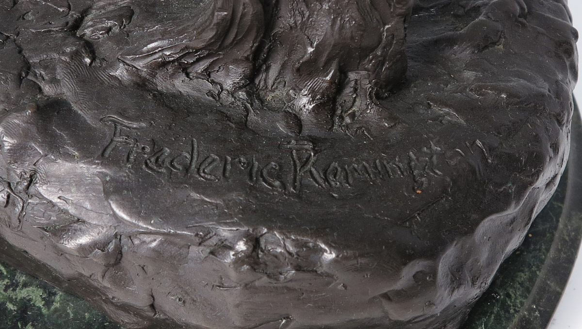 RATTLESNAKE BRONZE AFTER REMINGTON: 22 1/2'' h., incised signature, affixed to polished green marble plinth, 24'' overall.