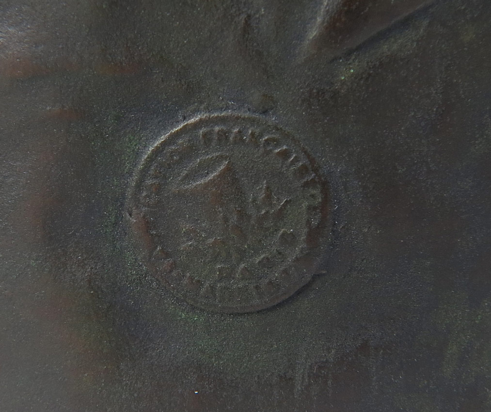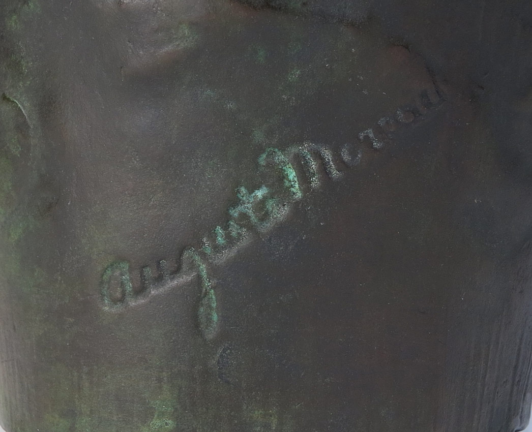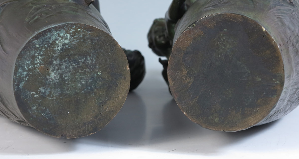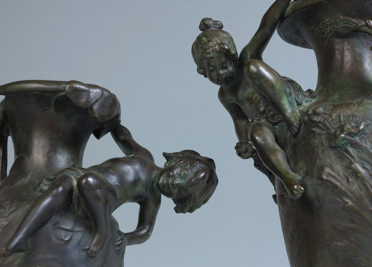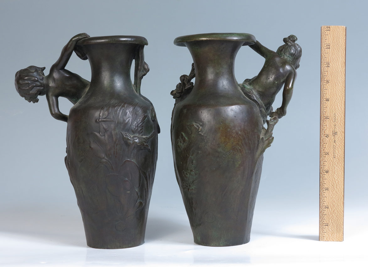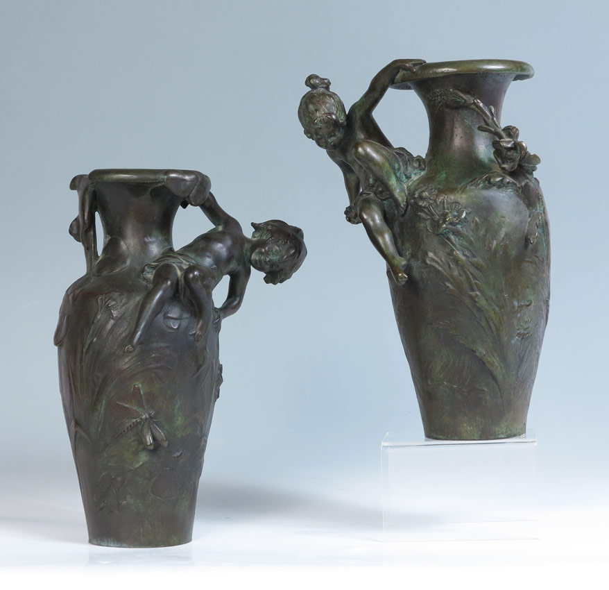 PAIR OF BRONZE NOUVEAU VASES AFTER AUGUSTE MOREAU: Vases depict young children clinging to the vase lip, relief floral and dragonfly motif, incised signature, 11 1/2'' h.