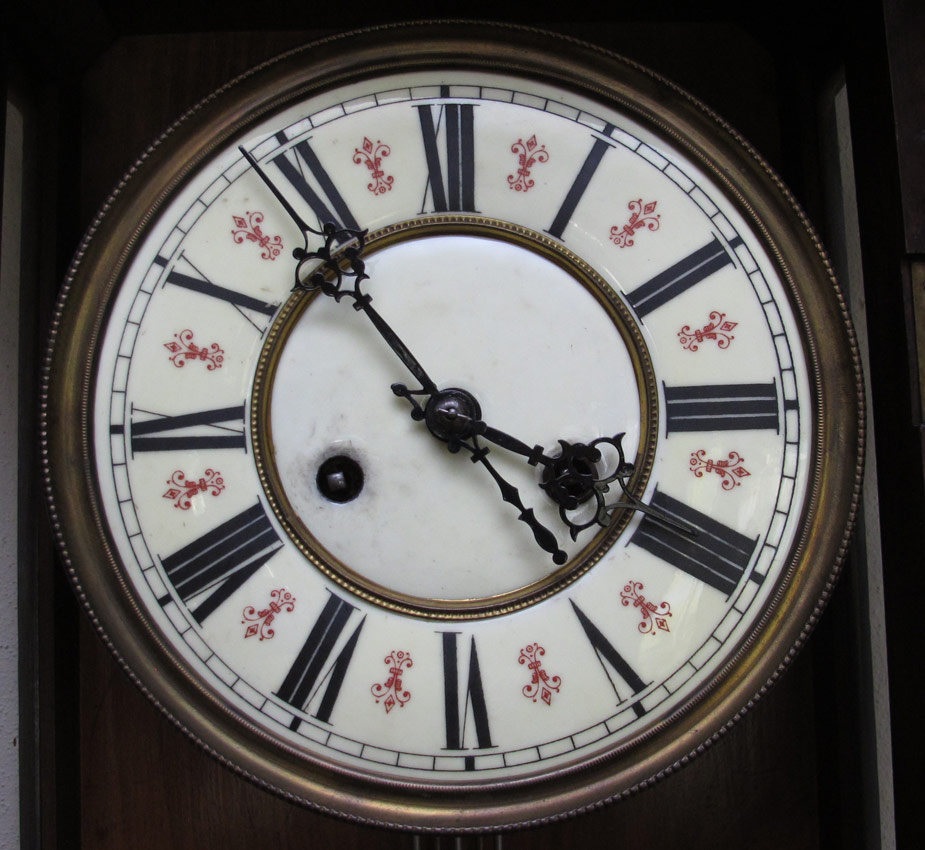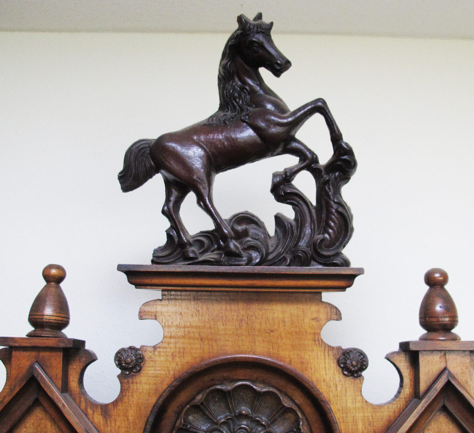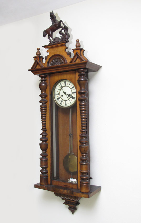 LARGE CARVED GERMAN REGULATOR WALL CLOCK: Architectural crest with carved horse finial. Walnut case with applied decoration. Porcelain dial with Arabic numerals, time and strike movement. Pendulum in case. Approx. 54'' h. x 18 1/2'' x 8''.