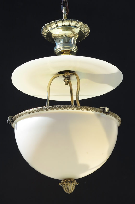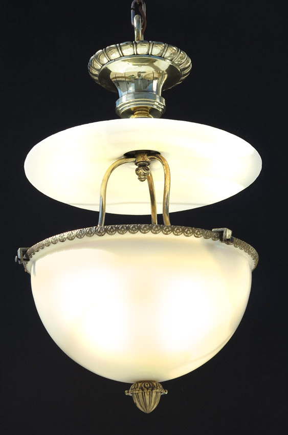 STEUBEN ART DECO CHANDELIER: Iridescent Calcite bowl and top platter type shade held in brass hardware, signed in script. Measures approx. 26'' l. x 14 dia., excluding the chain.