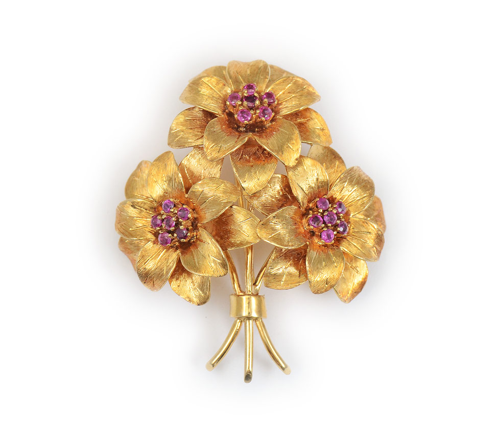 18K RUBY TIFFANY & CO. BROOCH: A fine 18K yellow gold flower brooch of 18 round mixed cut rubies totaling approx. .65 Ct. The rubies are prong set as the center of three flowers. Bar pin closure. 1 7/8''L. Weight: 17.3 grams. Signed: Tiffany & Co.