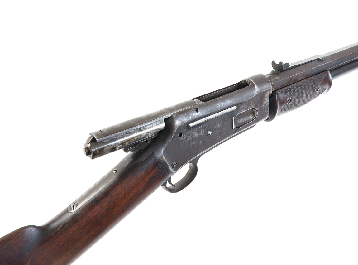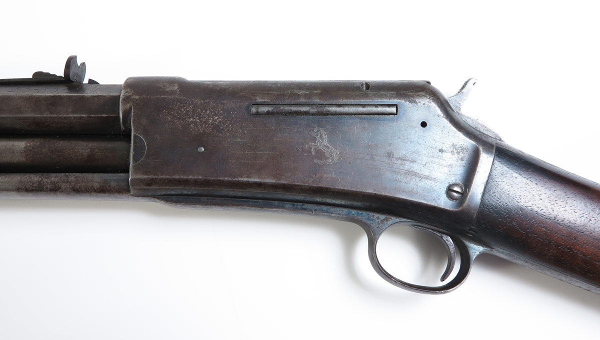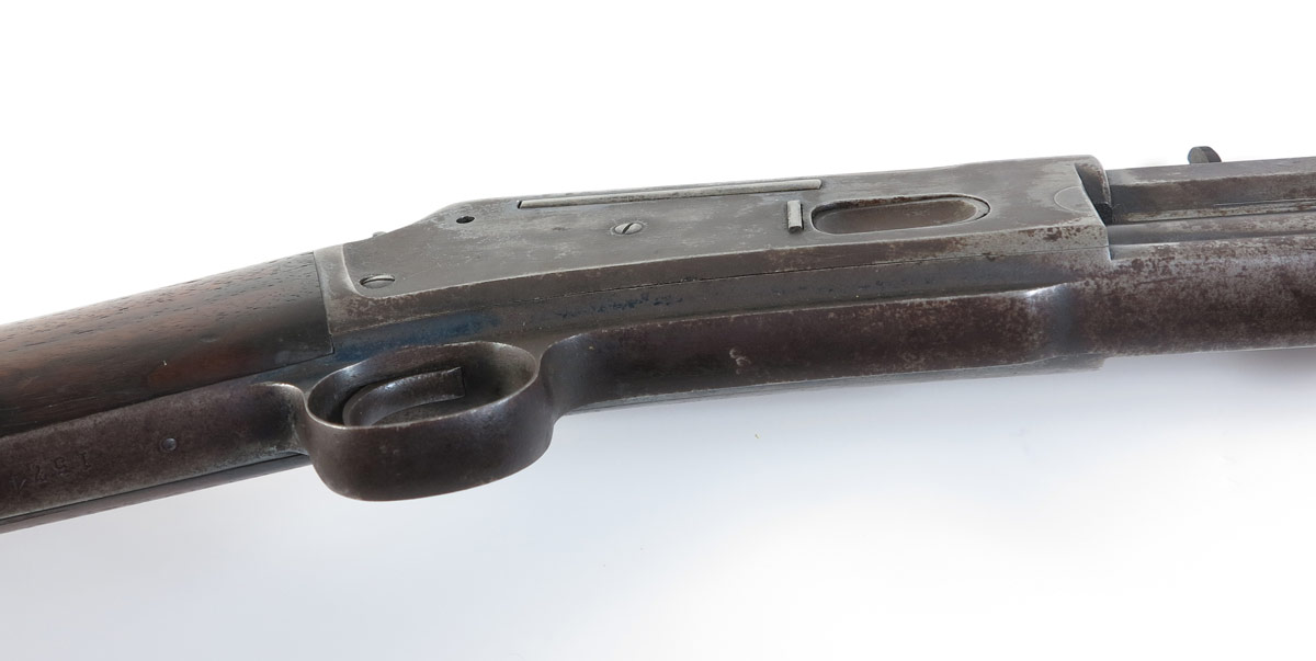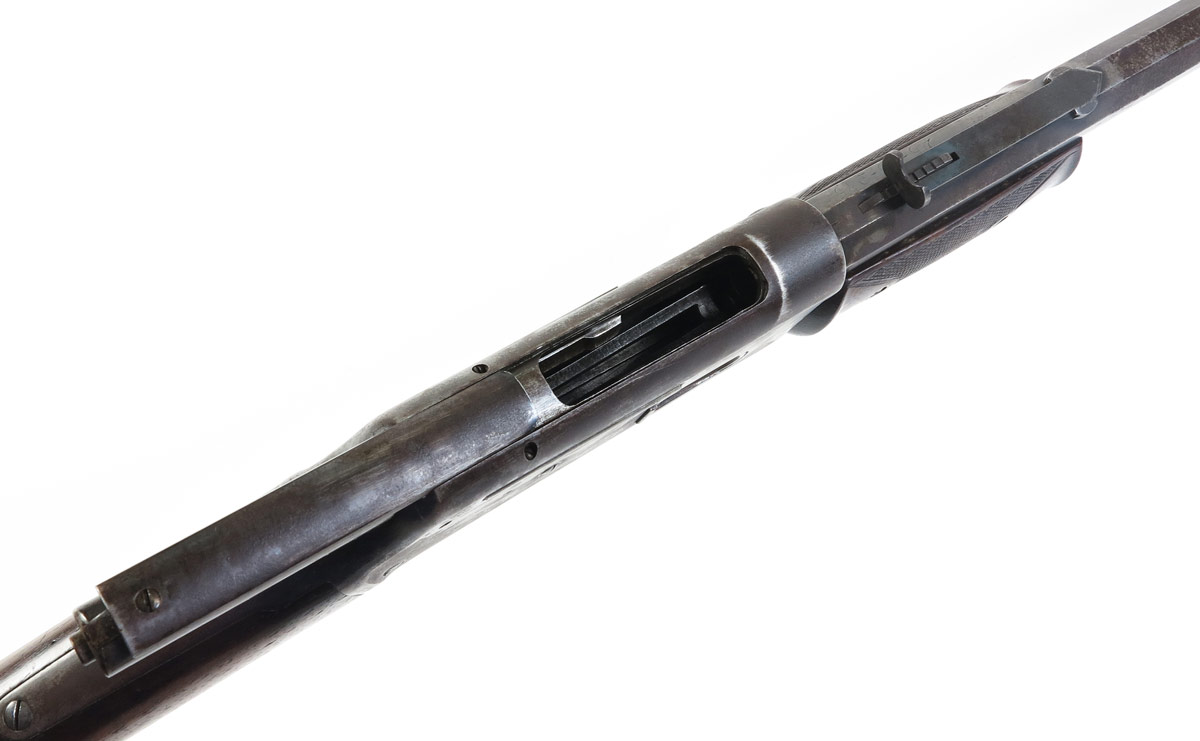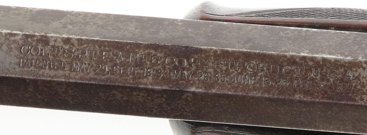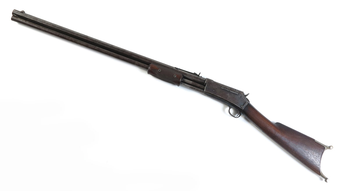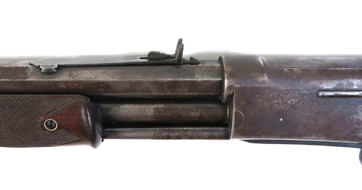 COLT LIGHTNING LARGE FRAME EXPRESS RIFLE: The most desirable of the Colt Lightning pump action rifles; this large frame example has a 45-85-285 caliber 28'' octagon barrel. Only 6,496 of these rifles were produced, this is serial number 1574. 2 line colt address on top of rapid tapered barrel with last patent date of '87. Nickel plated Schuetzen buttplate on walnut stock. Areas of original case color remain in protected areas, balance of finish mottled between plum brown and grey. Action works fine, clean bore.