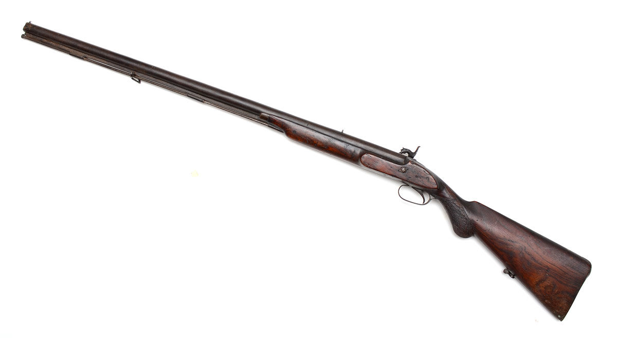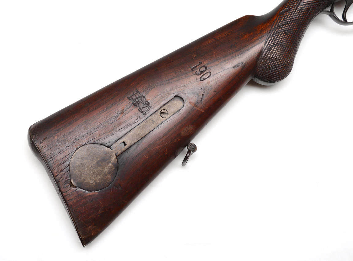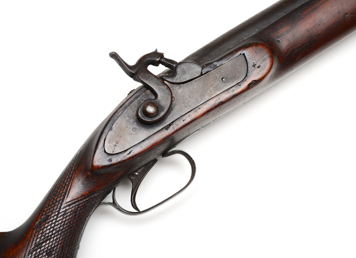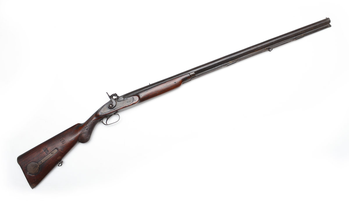 EUROPEAN PERCUSSION RIFLE: Large bore percussion rifle unmarked as to maker, most likely European. Checkered wood stock, impressed by numbers 142 scratched through and 190, plain brass patchbox. 33 1/2'' barrel, with illegible stippled engraving, 49 1/2'' overall. Action sticks.