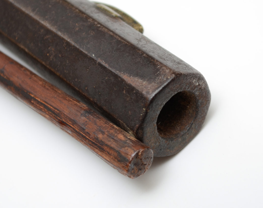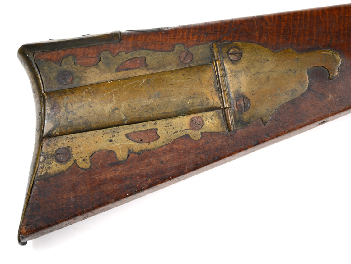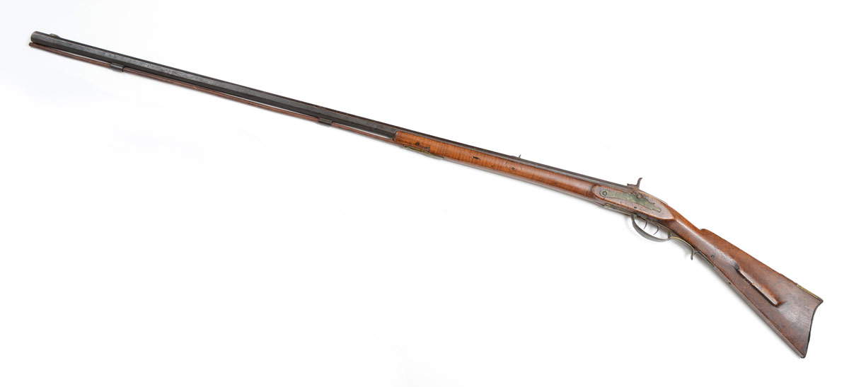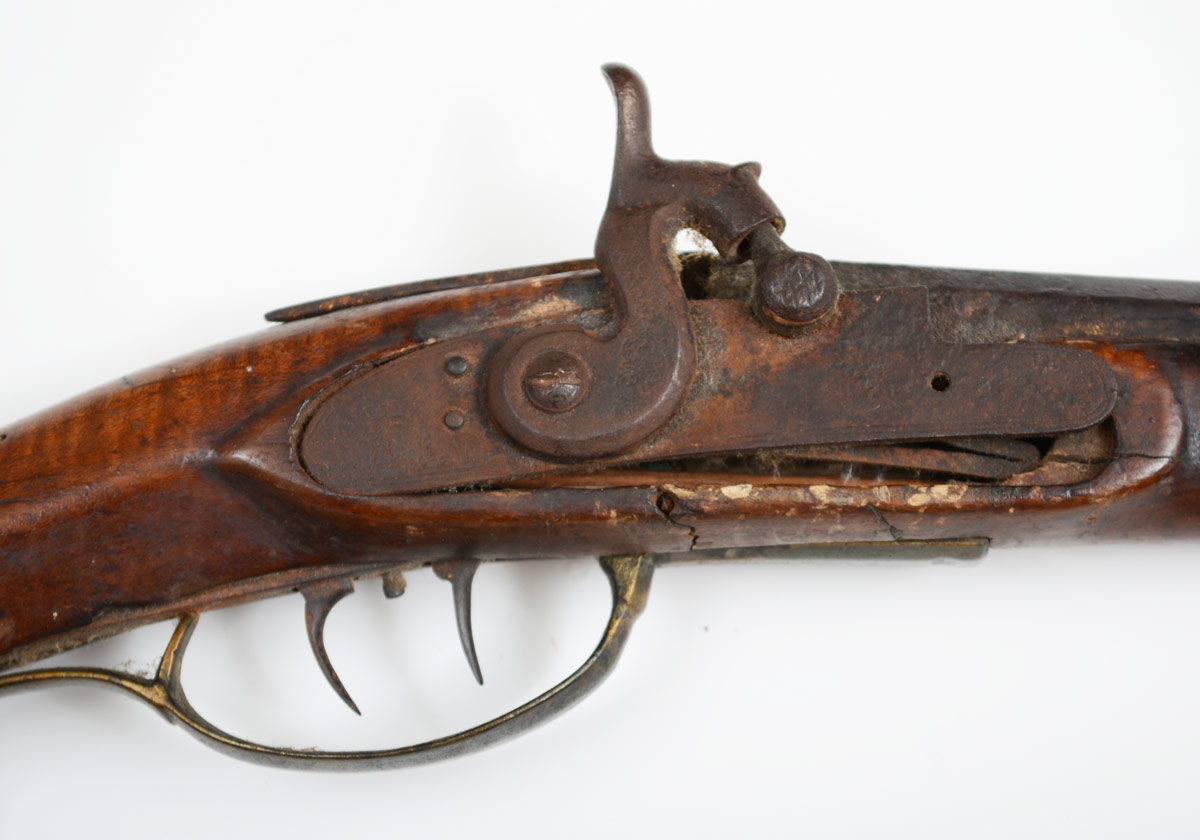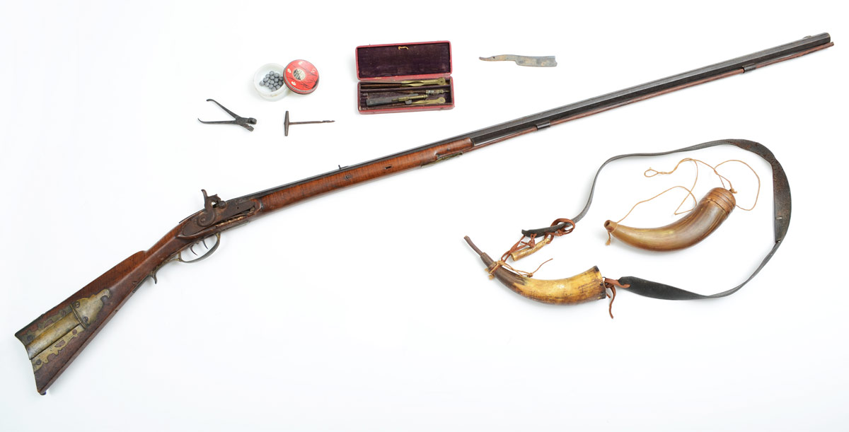 EARLY 19TH CENTURY KENTUCKY RIFLE WITH ACCESSORIES: Half stock rifle, poorly converted to percussion, most likely a Pennsylvania production. Curly maple stock, patchbox with figural eagle head end. Unsigned 45'' octagon barrel. Sold with 2 horn powder flasks, one with leather hanging belt, bullet mold, other accessories, and copies of some family paperwork. This gun and accessories has come down through the direct descendants of Revolutionary War hero General William Richardson Davies.