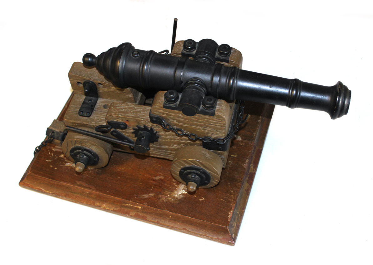 CAST IRON SIGNAL CANNON: Japanned black finish to cast iron barrel and mounts. Brown painted wood carriage, all mounted to wood base. Barrel length 11'', overall 7'' h. x 13 1/2'' x 8''.