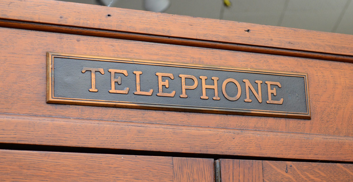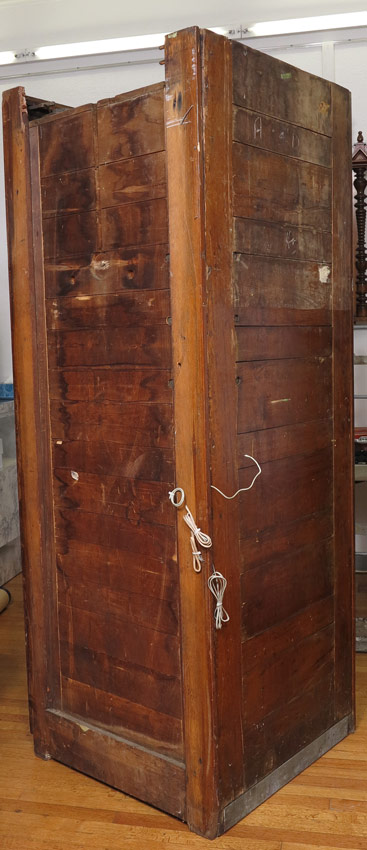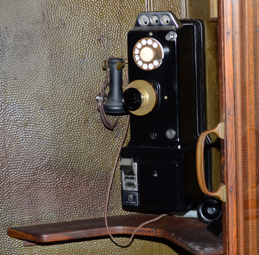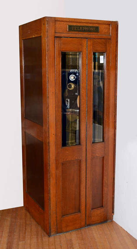 ANTIQUE TELEPHONE BOOTH WITH PHONE: Right hand side mount to wall or other booths leaves right hand side unfinished. 2 sliding front doors. Metal clad interior with period rotary phone inside. Sold with unattached replacement handle included with phone.
