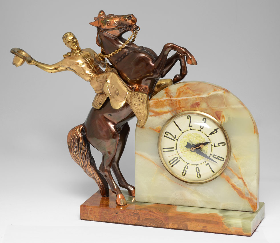 FIGURAL BUCKING BRONCO ONYX MANTLE CLOCK: Figural bronzed and gilt finish cowboy on a bucking bronco horse, green onyx base and frame for electric Lanshire movement clock. 11 1/2'' h. x 14'' x 5 1/4''.