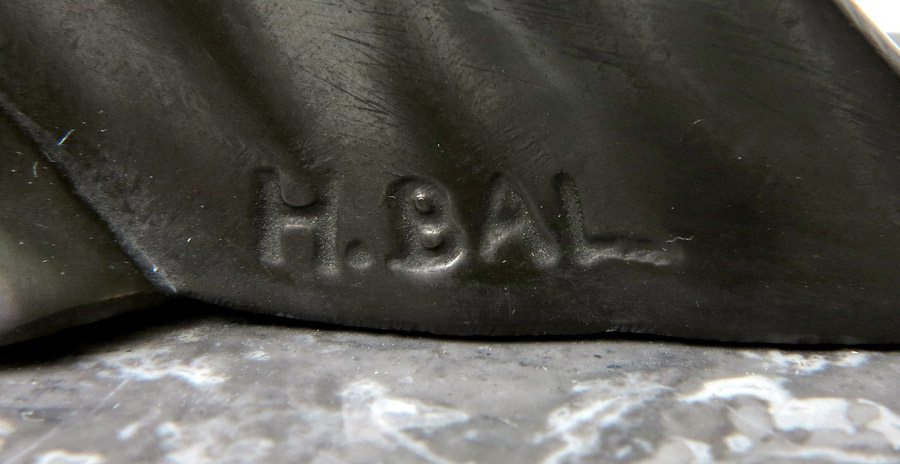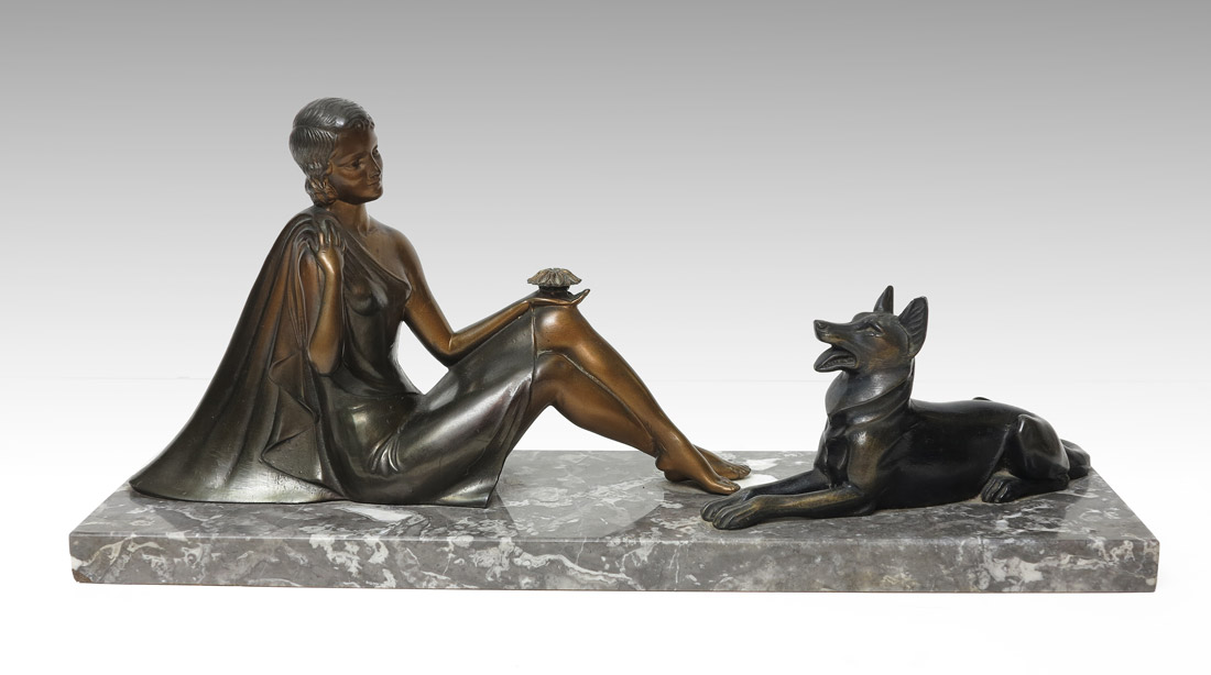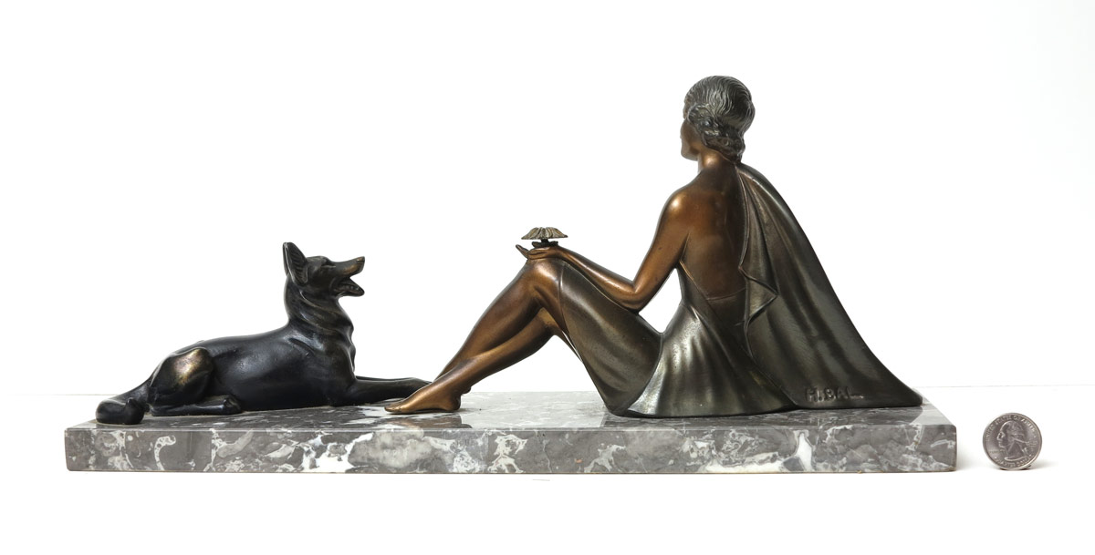 FIGURAL ART DECO BRONZE SIGNED BAL: Figures of a seated maiden holding a flower and a German shepherd dog mounted to marble base. Signed H. Bal on woman. Measures 7'' h. x 15 3/4'' x 4 3/4''.