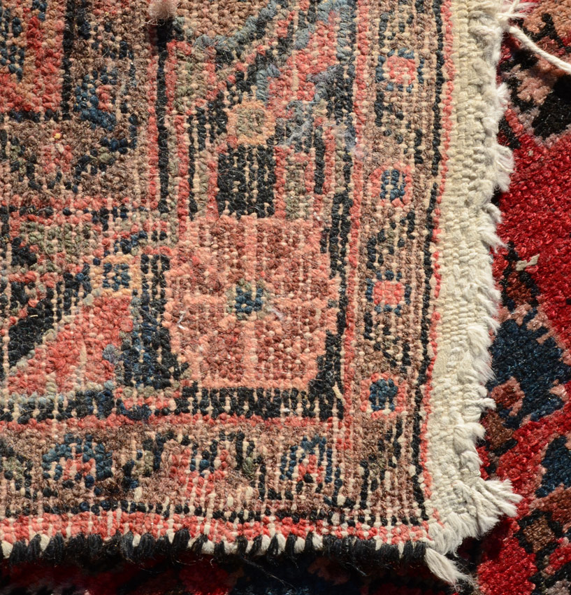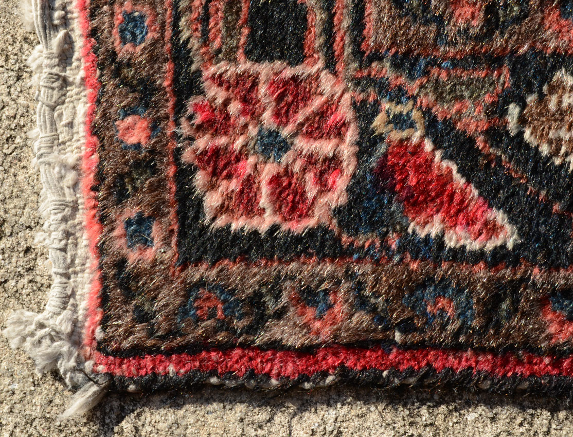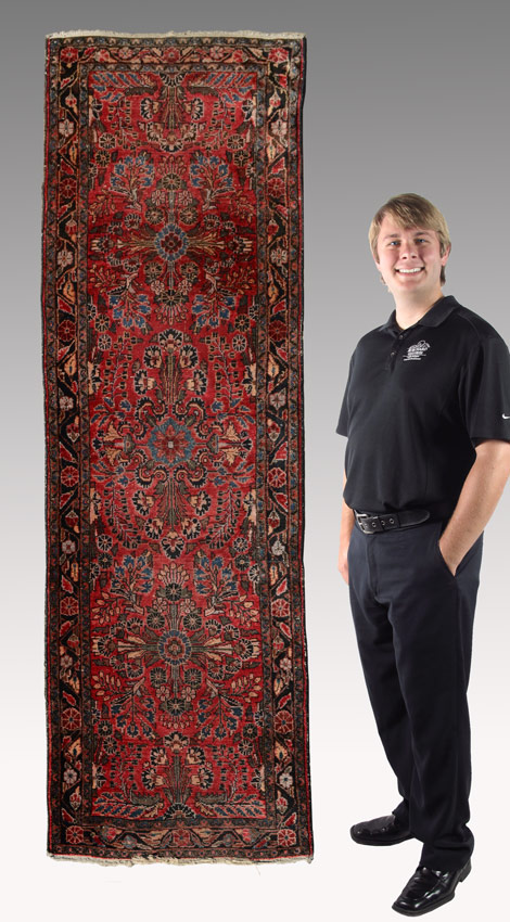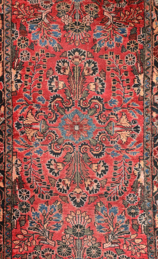 SEMI-ANTIQUE PERSIAN HAND KNOTTED WOOL RUG, 2'6'' x 8'1'': This rug has another variation of a traditional Sarouk design but is better classified as a Lillihan. The runner has a row running down the center of sprays of flowers that form loosely drawn medallions. The red field serves as a good background for the flower medallions in colors of pale green, pale yellow, rust, black, blues, and white. The main borders black ground does a great job of framing the center of the runner. This would be an attractive, yet sturdy addition to go with your room size Sarouk. Condition is good, with evenly low pile.