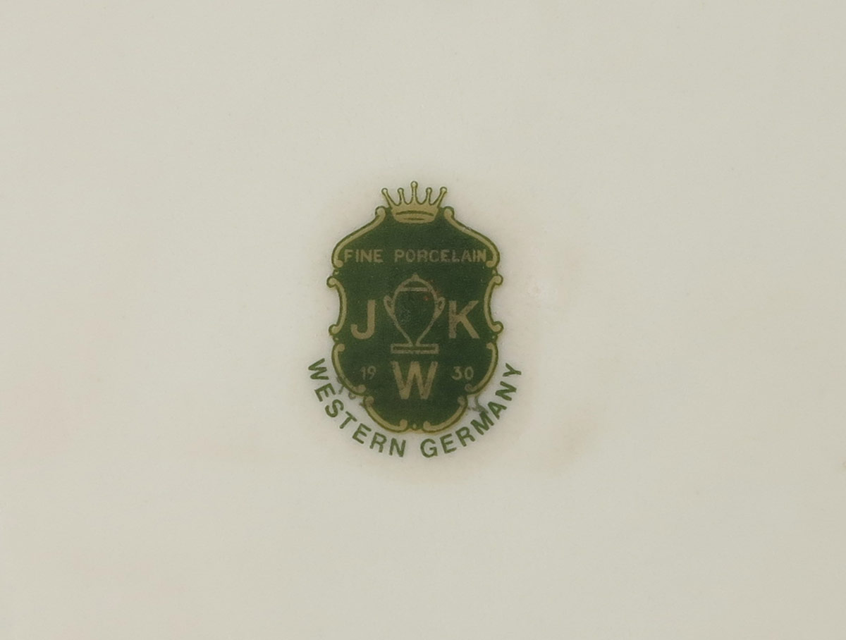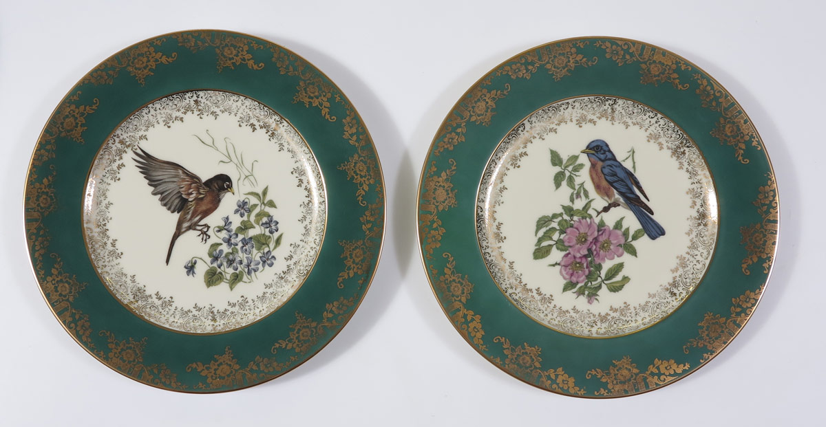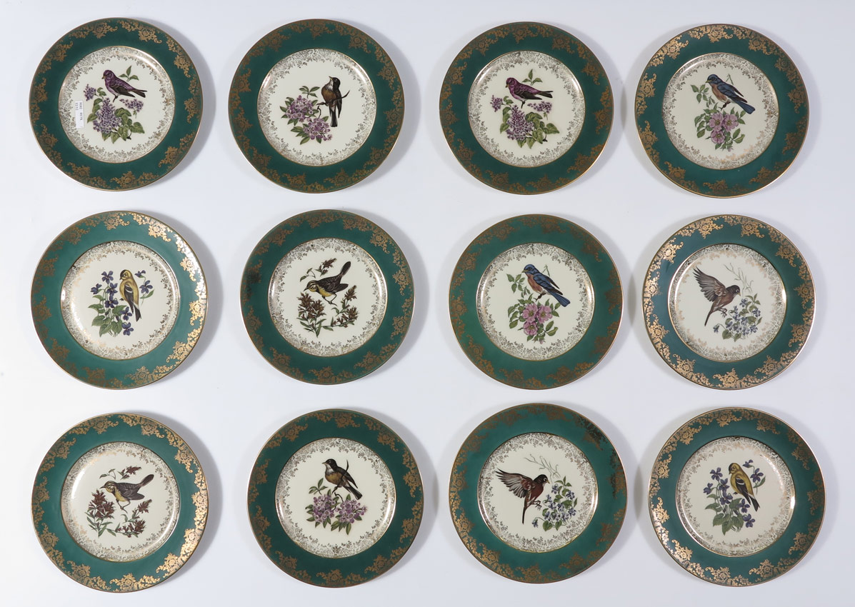 SET OF 12 SERVICE PLATES: Central bird design with lacy gilding over dark green border. 11'' dia. JKW, Western German.