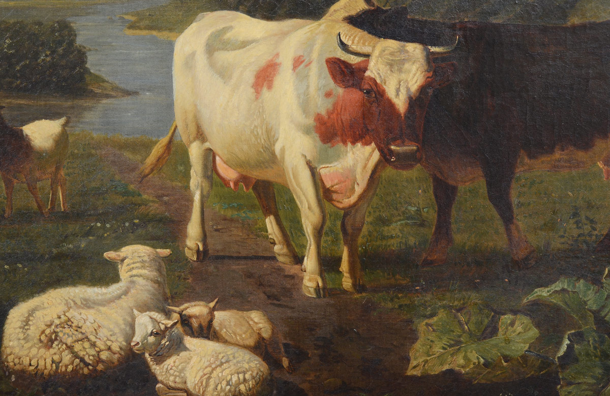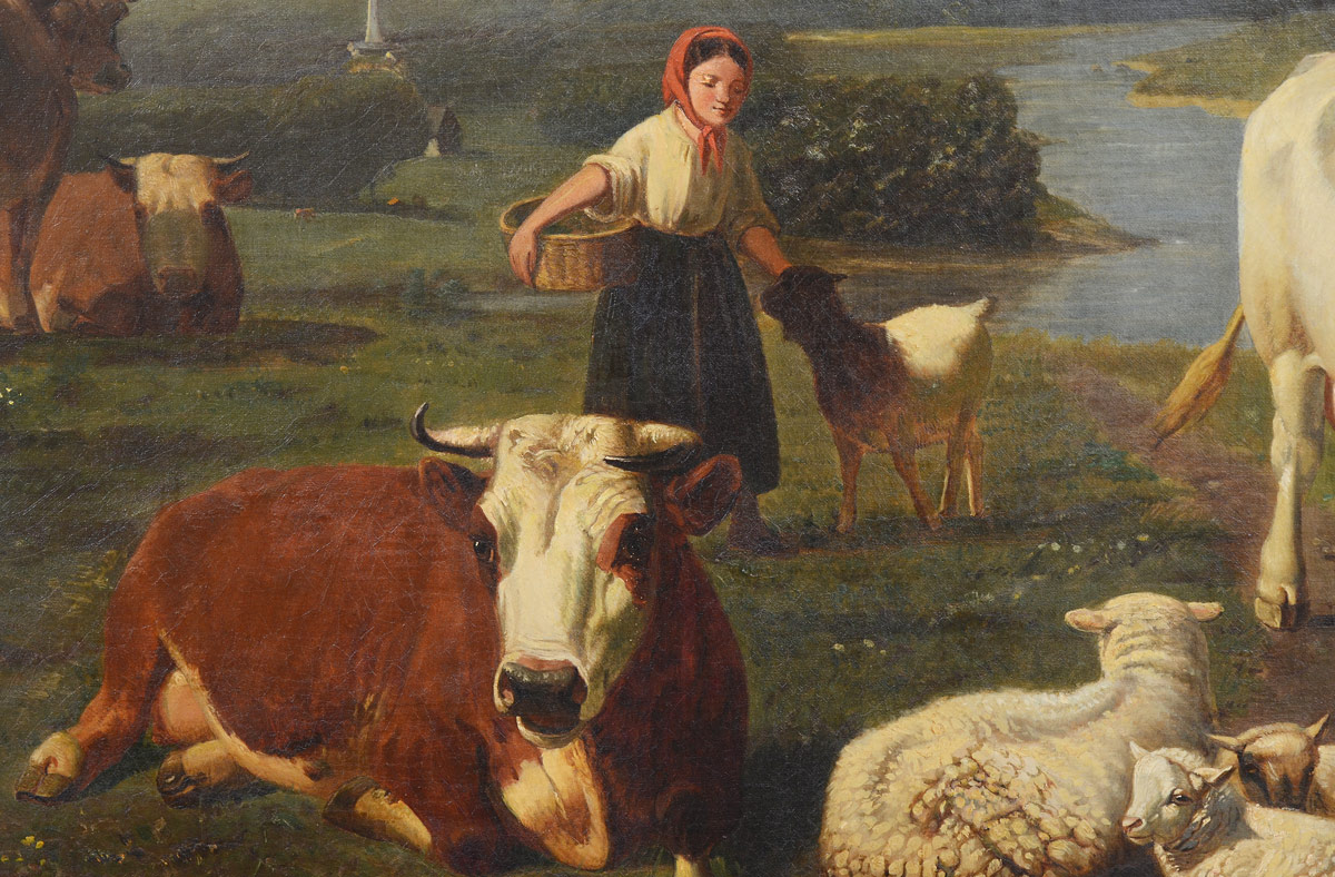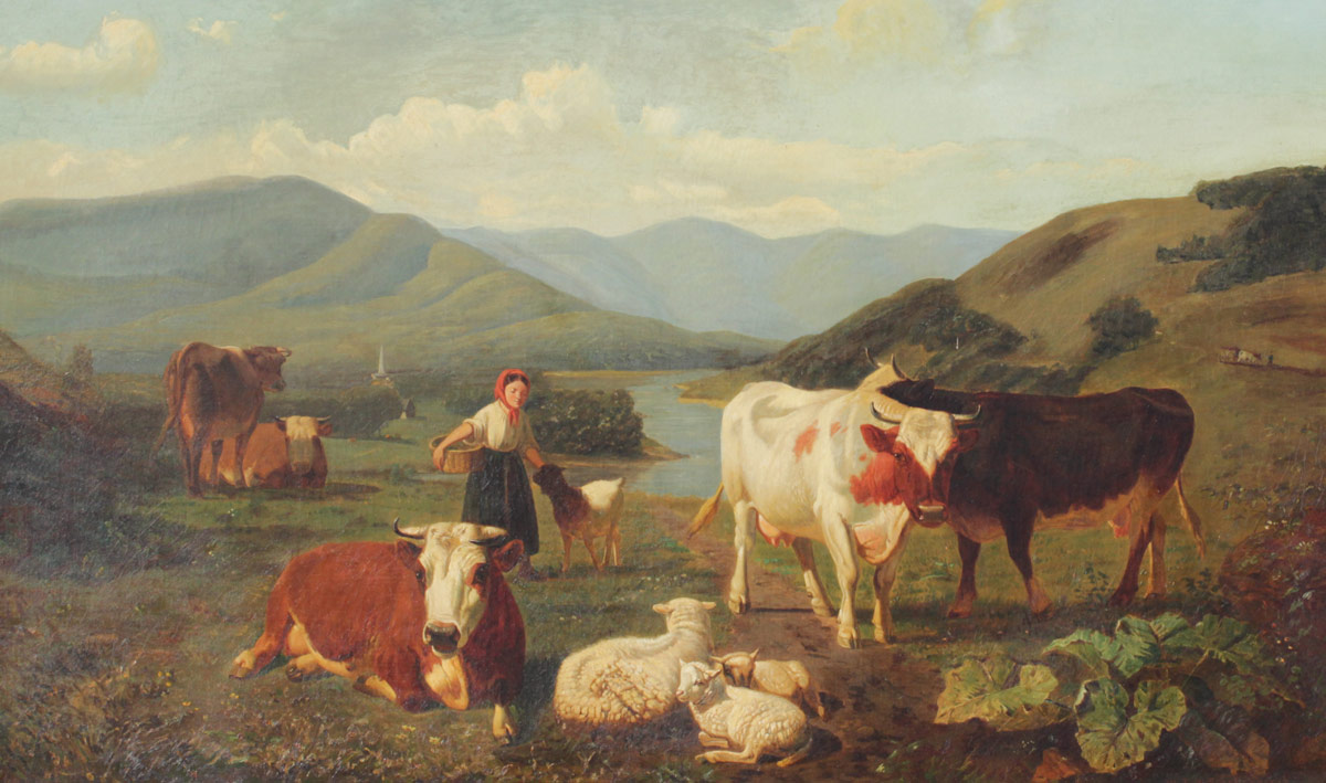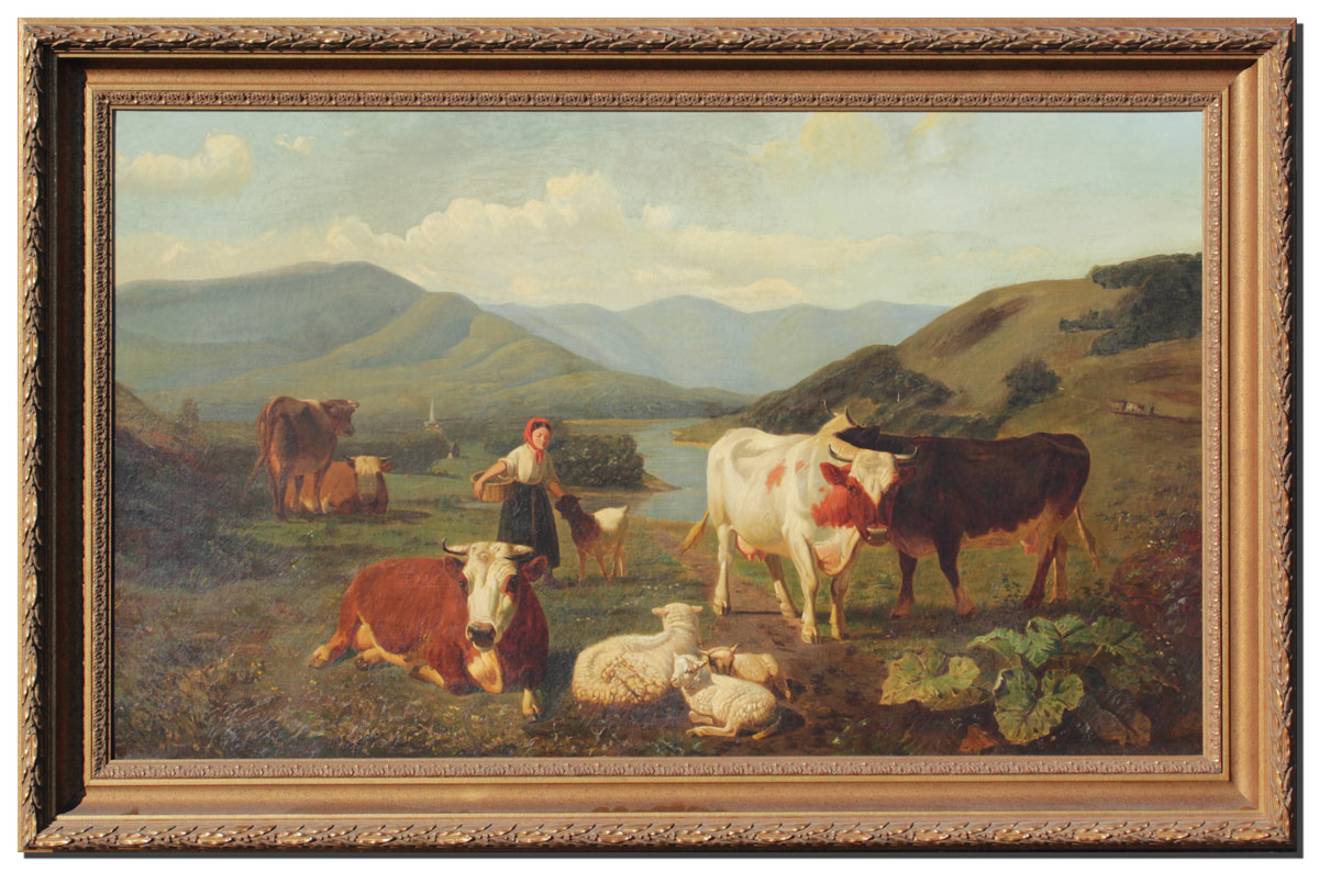STACHOUWER, Willem Tjarda Van Starckenborgh, (Dutch, 1823-1885): Panoramic Country Landscape with Farm Girl, Cattle, & Sheep, Oil/Canvas, 30'' x 50 1/4'', signed lower right, later frame 38'' x 57 1/2''.