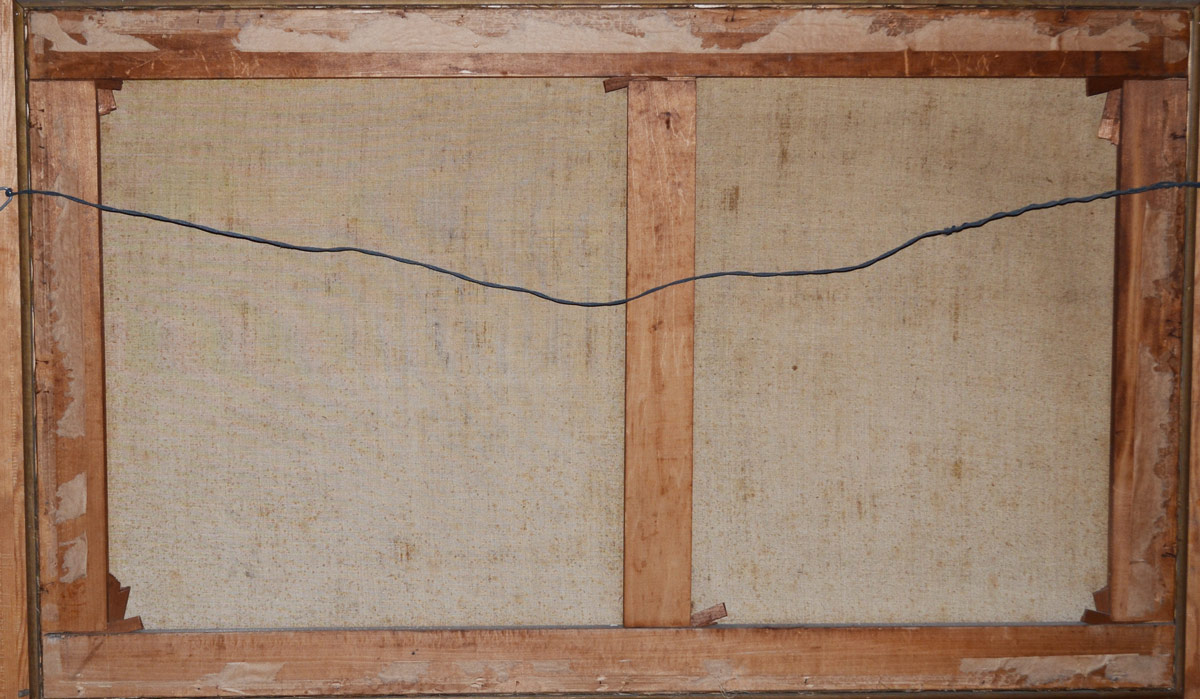 CONDITION: Relined, scattered craquelure throughout, needs cleaning. Several abrasions, scattered inpaint throughout.