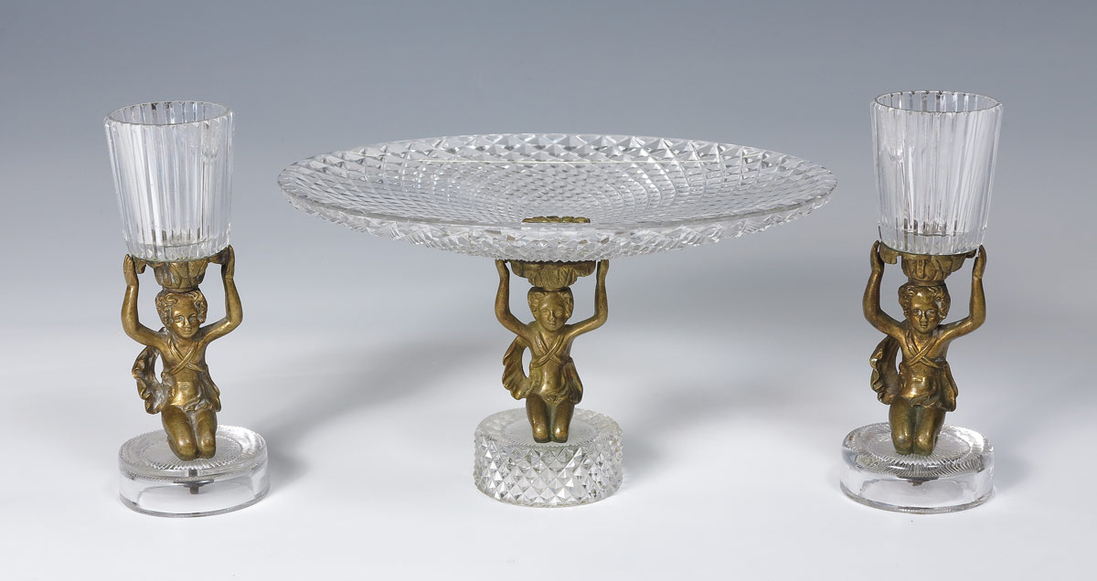CUT GLASS & BRONZE? FIGURAL COMPOTE GARNITURE SET: To include compote with cut glass top, figural bronze? / brass? putti body and cut glass base. 5 1/2'' h. x 9'' dia. Sold with 2 matching candleholders, 6 1/2'' h.