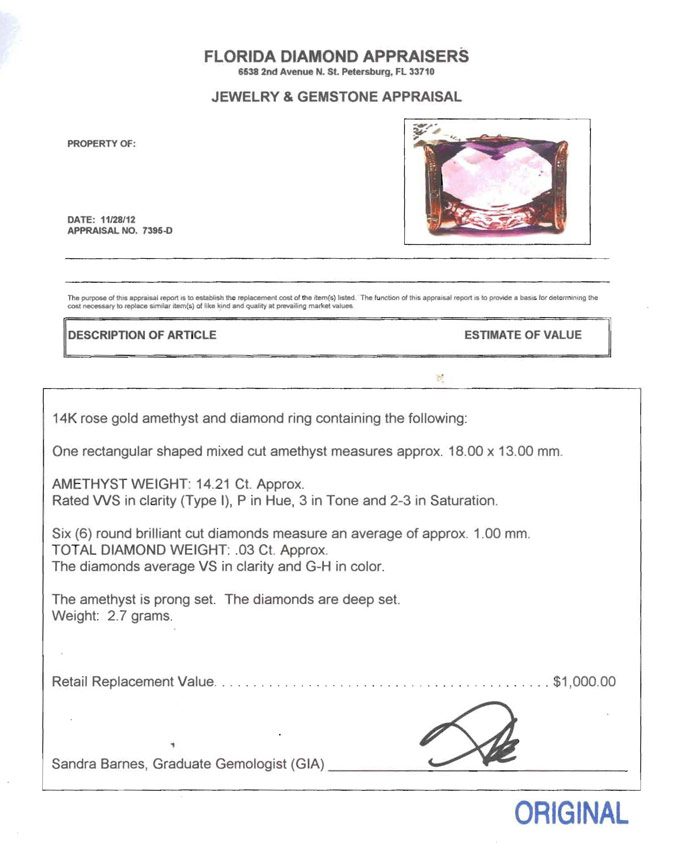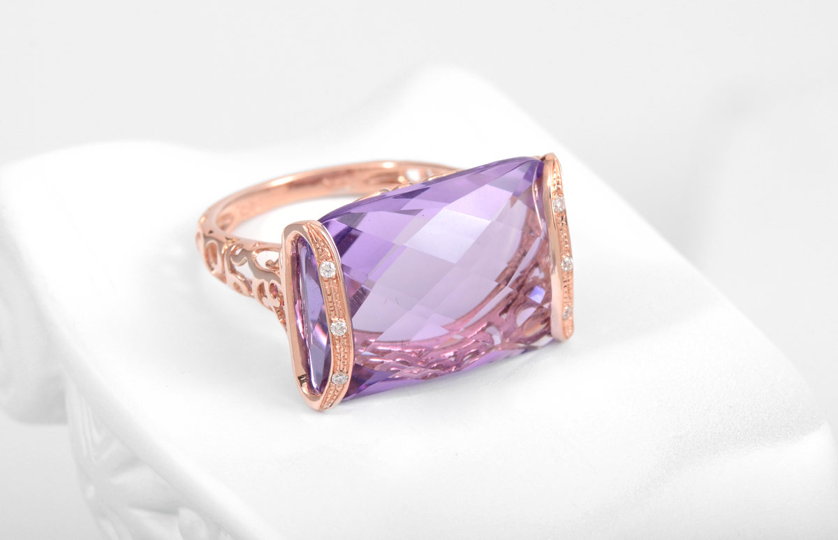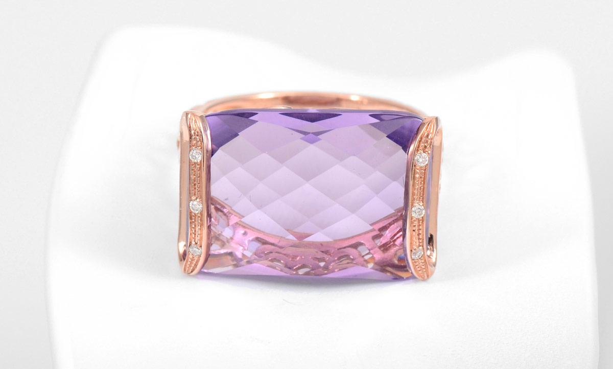 14K ROSE GOLD AMETHYST & DIAMOND RING: 14K rose gold ring centers an approx. 14.21 Ct rectangular mixed cut amethyst, VVS in clarity. The filigree setting is studded with 6 round brilliant diamonds totaling .03 Ct., averaging VS in clarity and G-H color. Amethyst is prong, diamonds deep set. Size 6.5. Weight 2.7 grams. Sold with current Florida Diamond Appraisers GIA graduates appraisal for $1000.