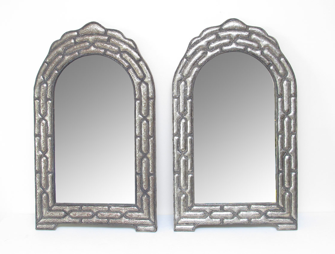 PAIR METAL CLAD MIRRORS: Arched shape, the frames clad in tooled metal. Measure approx. 47'' x 24''.