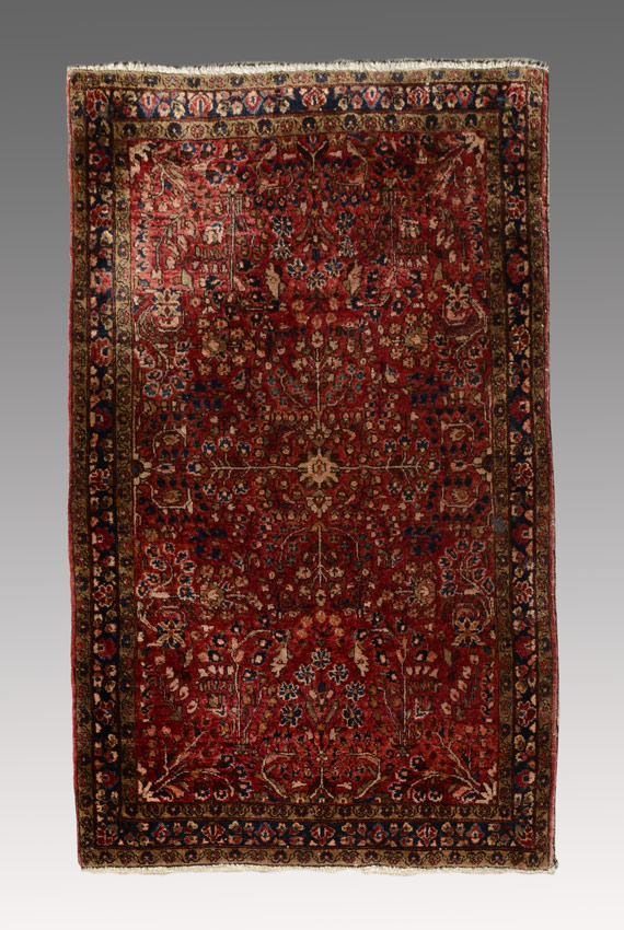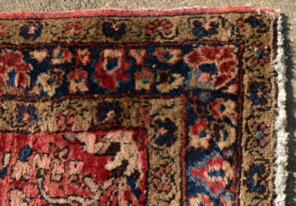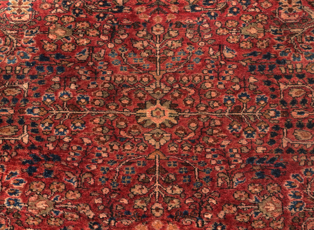 SEMI-ANTIQUE PERSIAN SAROUK HAND KNOTTED WOOL RUG, 3' 1'' x 4' 5'': This Sarouk has the traditional colors and designs that are found in rugs woven in this part of Persia ''Iran''. The pretty red ground is covered with a profusion of small flower heads executed in colors of two shades of blue, white, rust, yellow-beige, and black for the outlines and stems or vines. There is a central white larger flower head that has four white lines that go out like compass direction pointers, except that these have flowers branching out from them!
