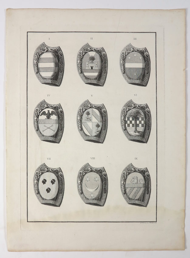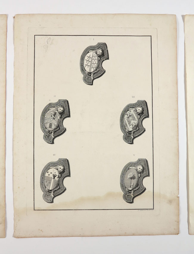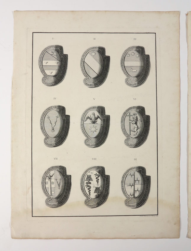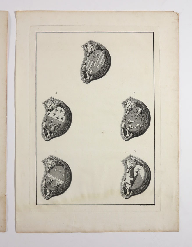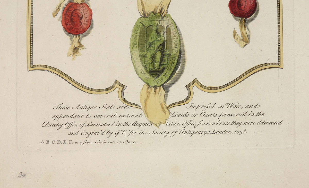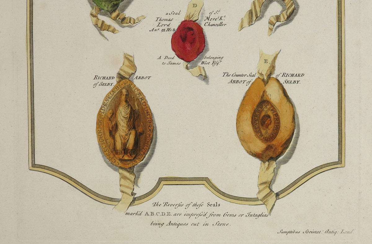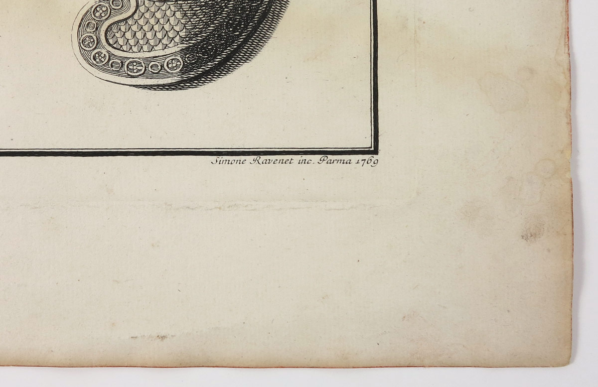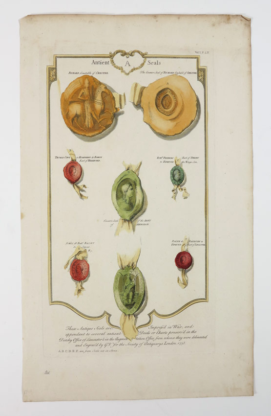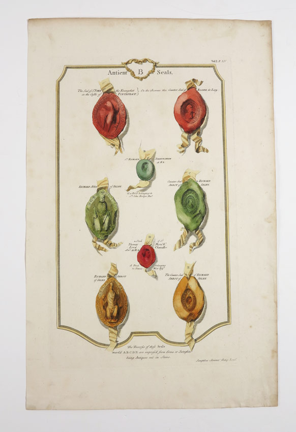 6 PAGES OF ANCIENT 18TH CENTURY ENGRAVED SEALS: 2 colored pages engraved by George Vertue for The Society of Antiquarys in London, dated 1736, approx.. 21'' x 13 1/2''; 2 pages engraved by G Zuliani in Parma dated 1769, 22'' x 16 1/4''; 1 page engraved by Simone Ravenet dated 1769, approx. 22'' x 13 1/4''; and 1 page engraved by G. Parini in Parma dated 1769, approx. 22'' x 16 1/4''. Sold as a lot