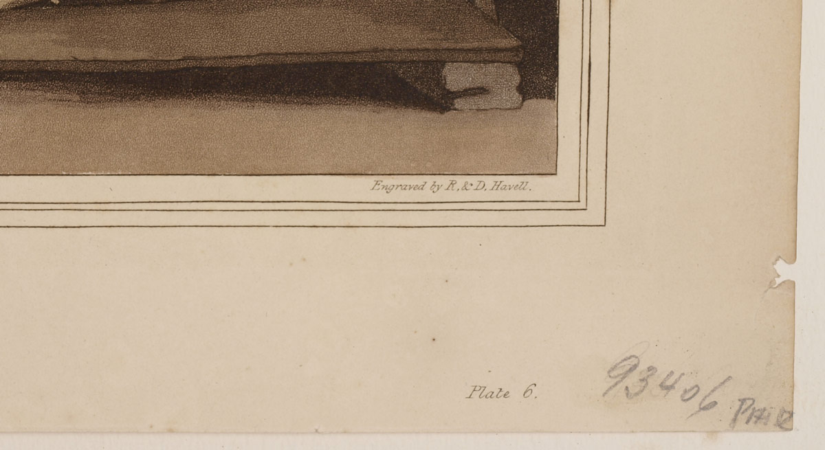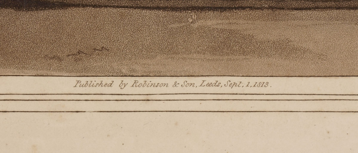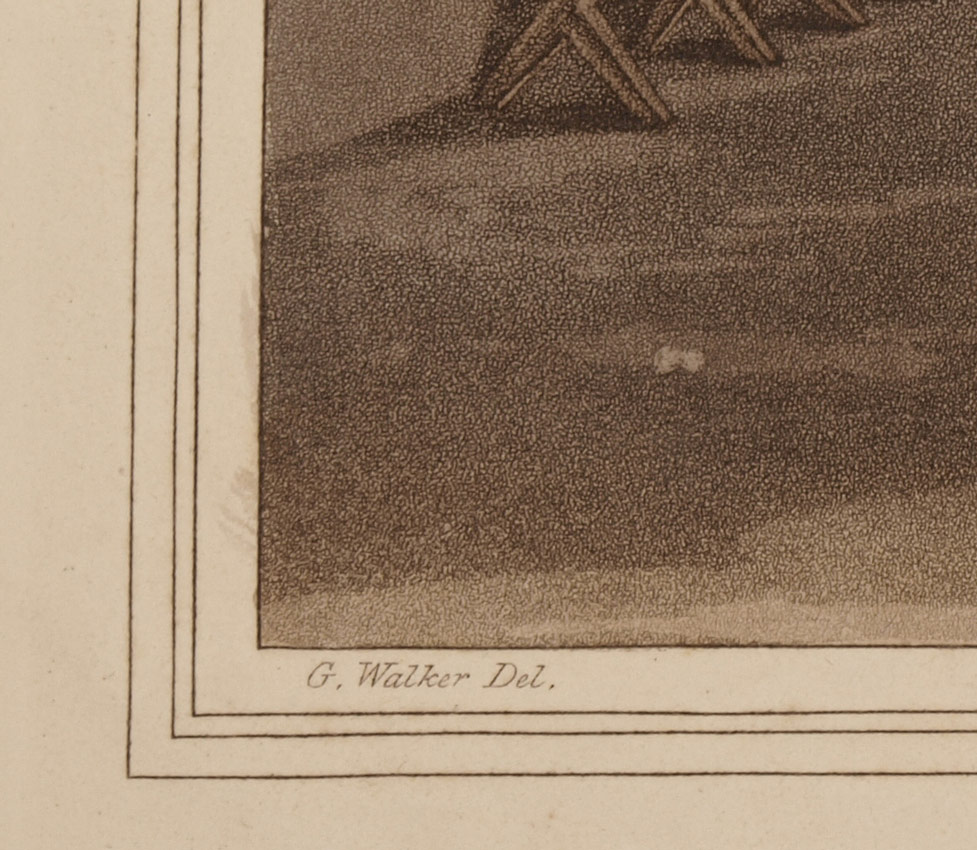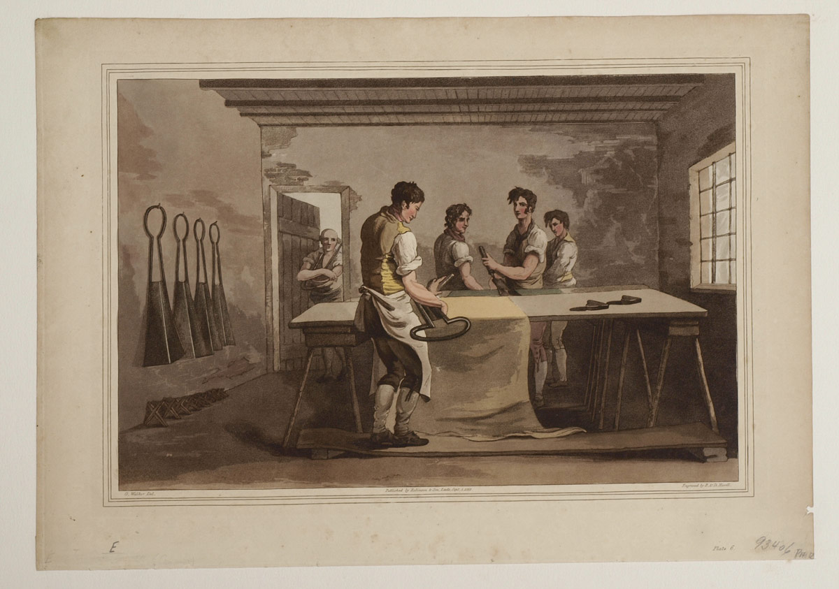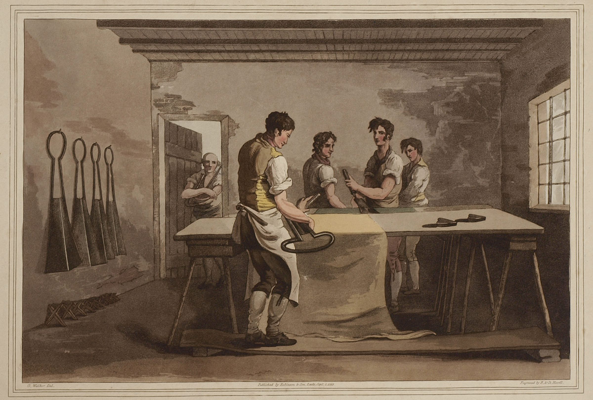 HAND-COLOURED AQUATINT BY ROBERT HAVELL AFTER GEORGE WALKER: ''The Cloth Dressers'' Plate 6 from The Costume of Yorkshire by George Walker, published 1813 by Robinson & Son of Leeds. The image shows a textile worker cropping or trimming woolen cloth with shears, after combing it with teasels to raise the nap. 10 3/8'' x 14 3/4'', matted 19'' x 16''.