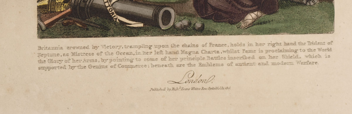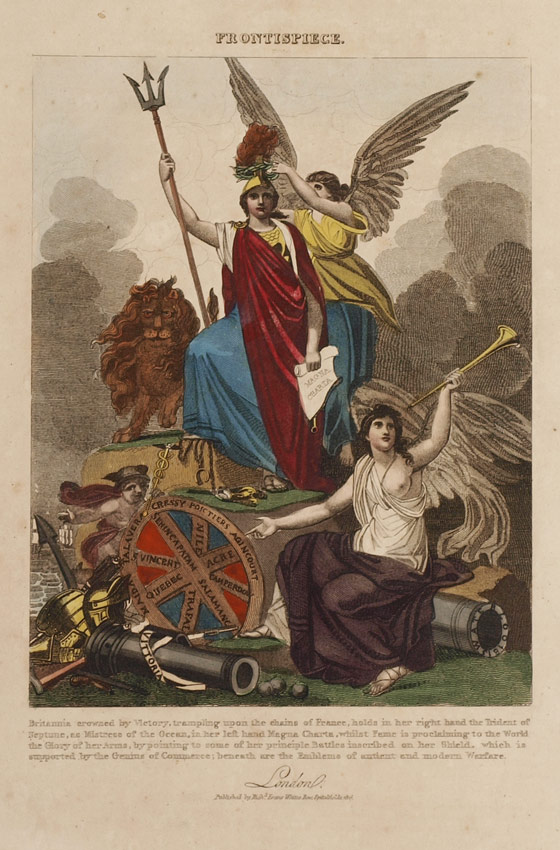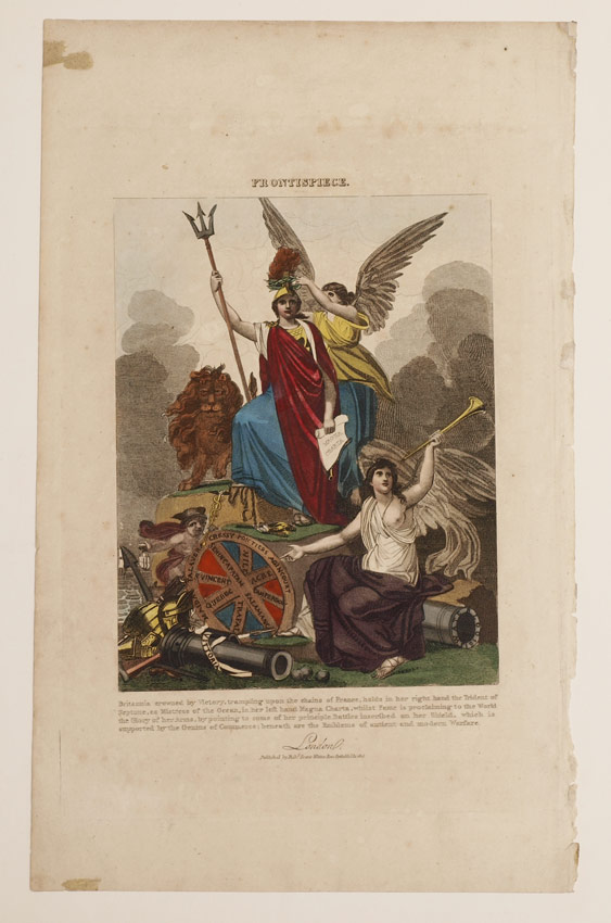 ALLEGORY OF BRITAIN CONQUERING FRANCE COLORED ENGRAVING 1816: Frontspiece engraving from ''The History of England'' from the Invasion of Julius Caesar to the Revolution By David Hume. Depicting Britannia crowned by Victory, trampling upon the chains of France, holds in her right hand the Trident of Neptune, as Mistress of the Ocean, in her left hand Magna Charta, whilst Fame is proclaiming to the World the Glory of her Arms, by pointing to some of her principle Battles inscribed on her Shield, which is supported by the Genius of Commerce; beneath are the Emblems of antient and modern Warfare. London, Published by Richd Evans Whites Row, Spitalfields 1816. Similar copy resides in the McGill University Napoleon Collection. 15 1/2'' x 9 1/2''.
