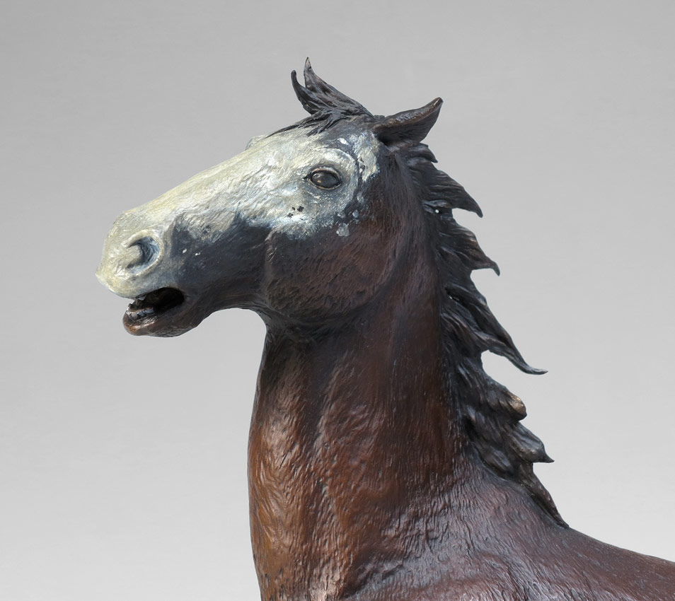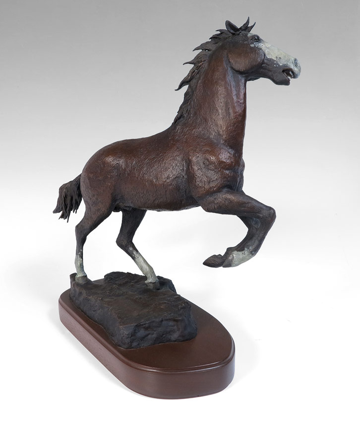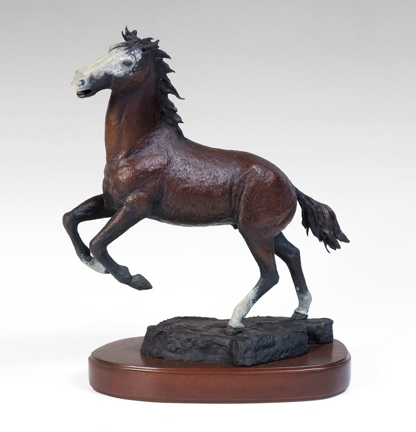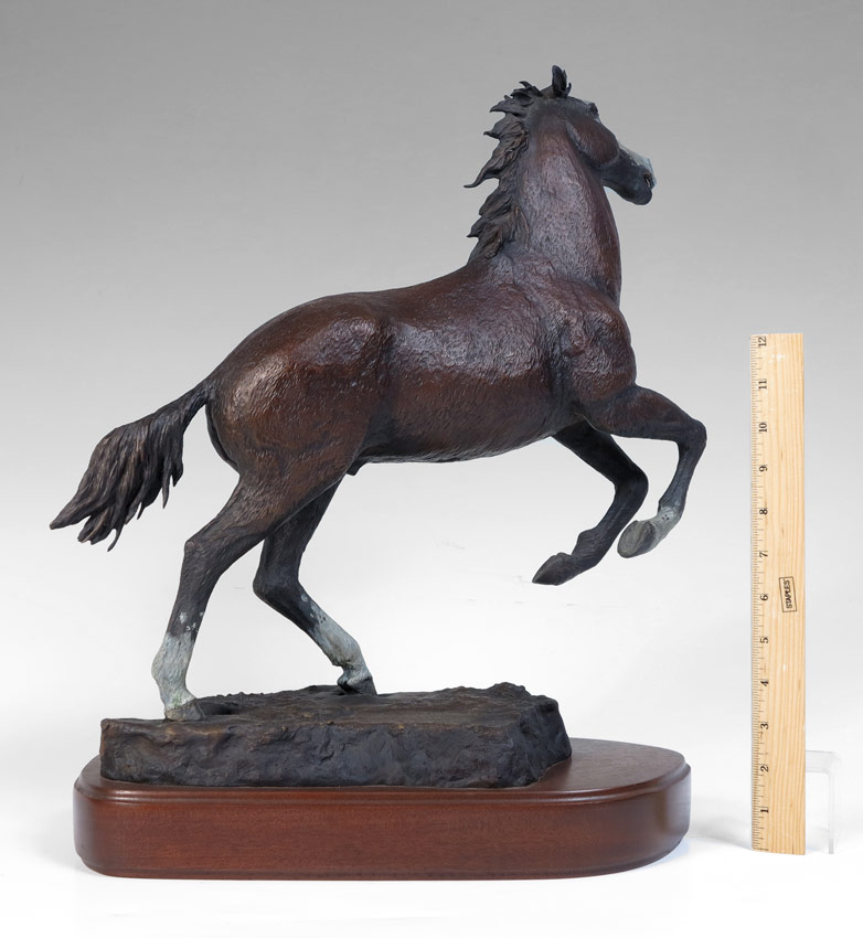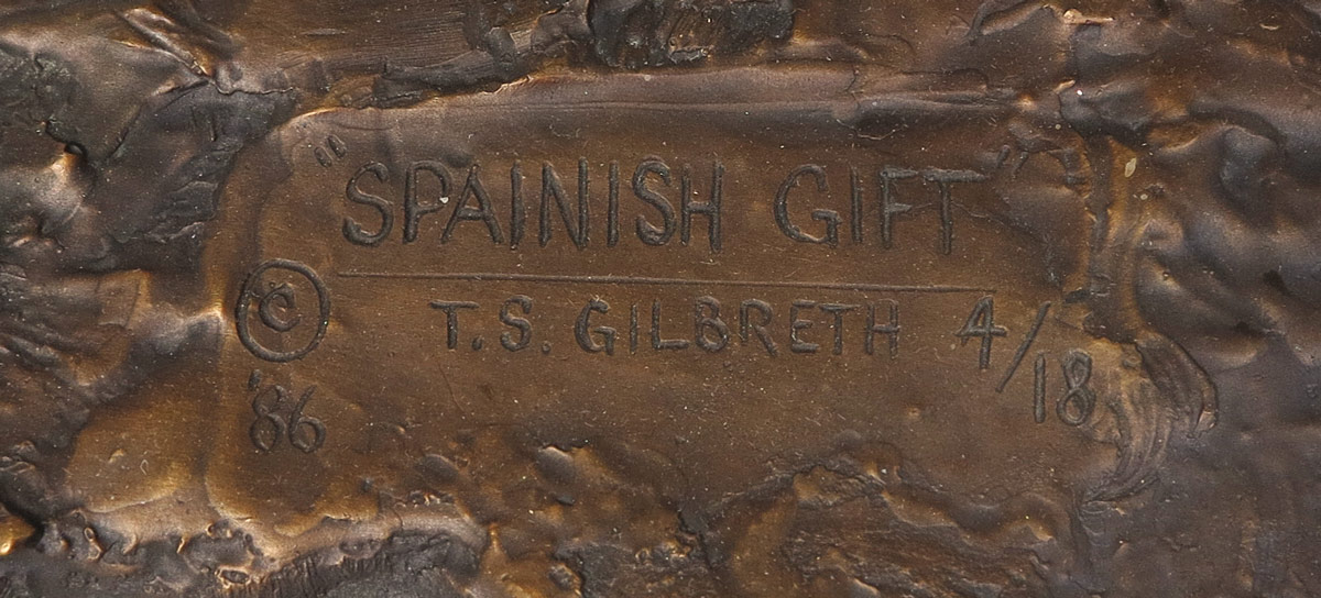 GILBRETH, T.S. (American, 1946- ): ''Spanish Gift'', Bronze, 17 1/4'' h., x 16 1/2'' w., incised signature along with incised title, #'d 4/18, dated '86, affixed to beveled wooden plinth, 20'' overall in height.