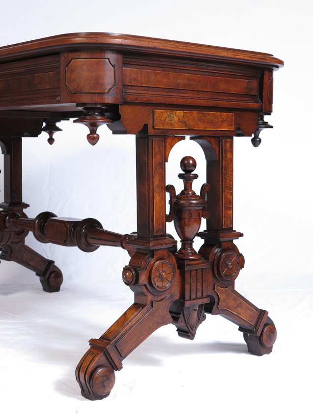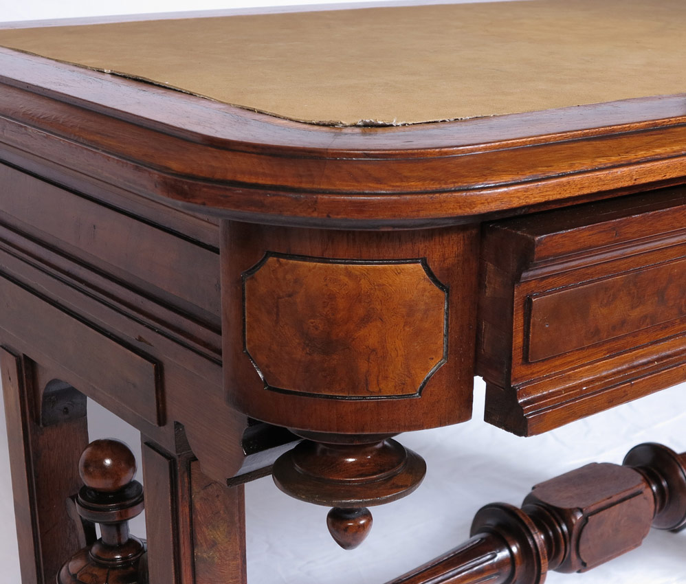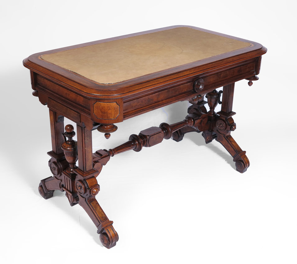 VICTORIAN LIBRARY TABLE: Single drawer leather top desk, ornate carved and turned legs and stretcher, 28''h. x 25'' x 42 1/2''